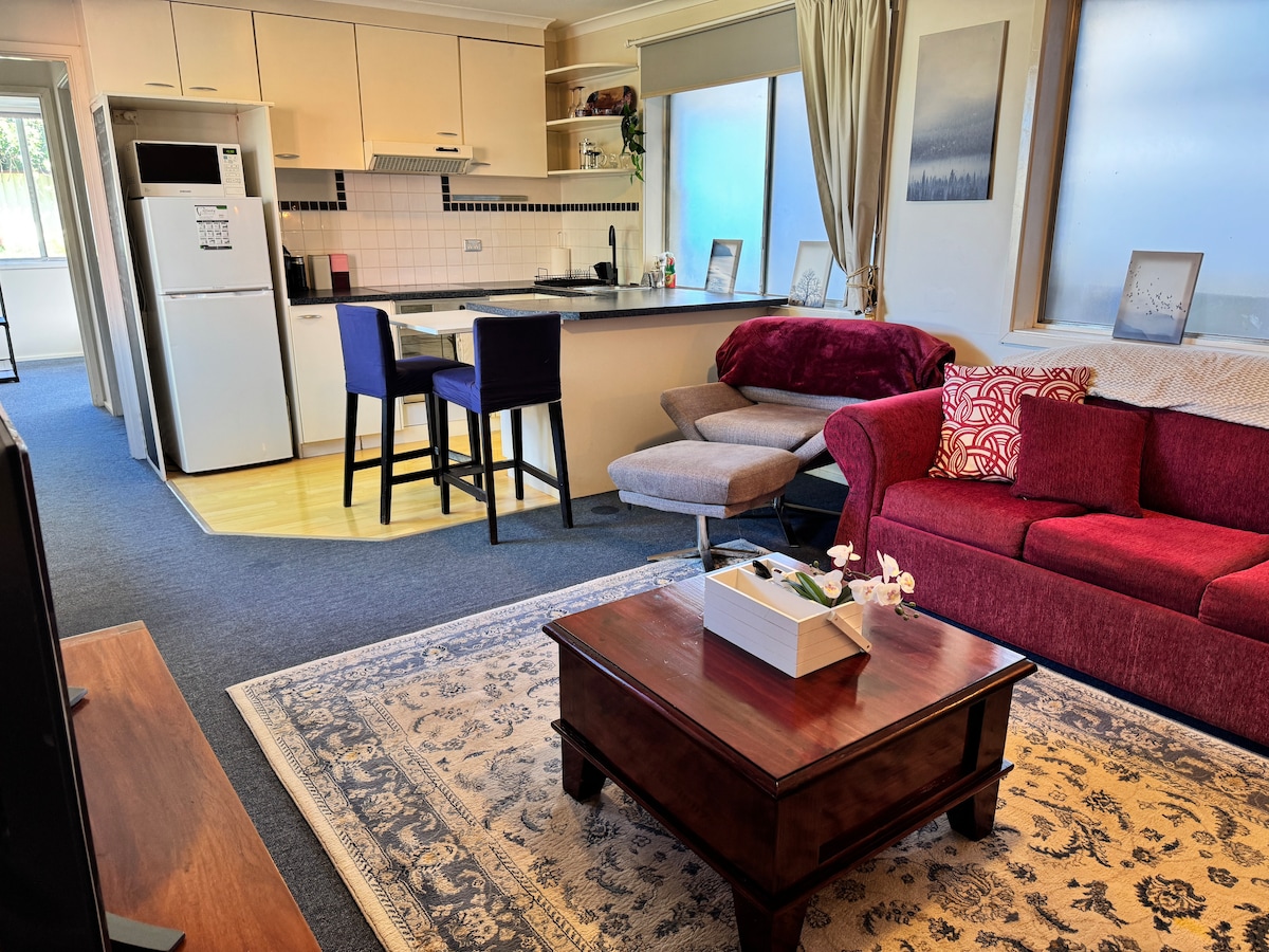 Privat suite i første etasje i det vakre huset vårt, praktisk plassert i Weston Creek. Ligger fem minutter fra Cooleman Court eller ti minutter fra Woden. Suiten har eget kjøkken, TV, queensize-seng, enkel ottoman-seng, sovesofa, bad og soloppvarmet svømmebasseng med saltvann. Vi ligger bak et naturreservat som er perfekt for en fredelig spasertur eller sykling. Det er rikelig med gateparkering på den rolige blindveien. Forespørsler om ekstra gjester er velkomne.