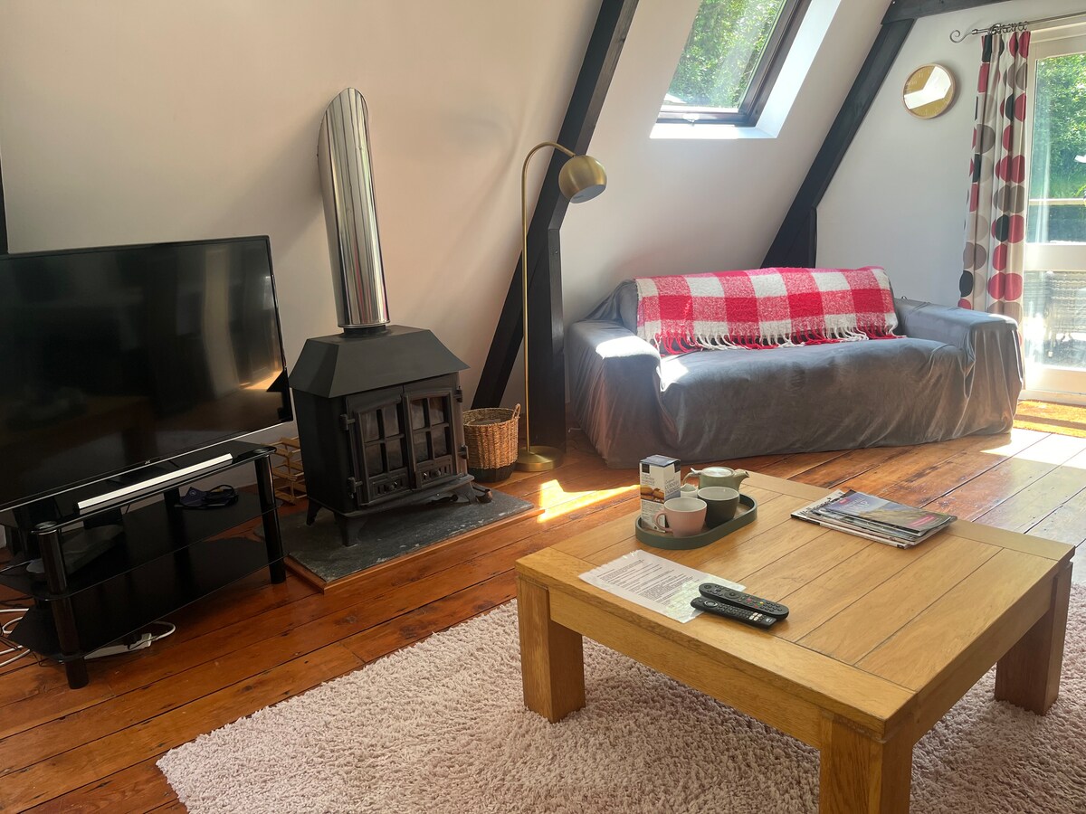 Hayloft er den nydelige, frittstående låven vår i stein. Det er perfekt for å utforske hele Cornwall. Ligger på et fredelig sted med vidstrakt utsikt over Cornwalls landskap og over til kysten ved Newquay. Den innmurte terrassen er perfekt for grilling, de firbente vennene dine og å sitte og nyte utsikten, de mest utrolige soloppgangene med en kaffe eller stjernekikking med et glass vin. Hayloft er lett og moderne med strippet tregulv, høye takbjelker og en koselig vedovn for vinterkvelder.