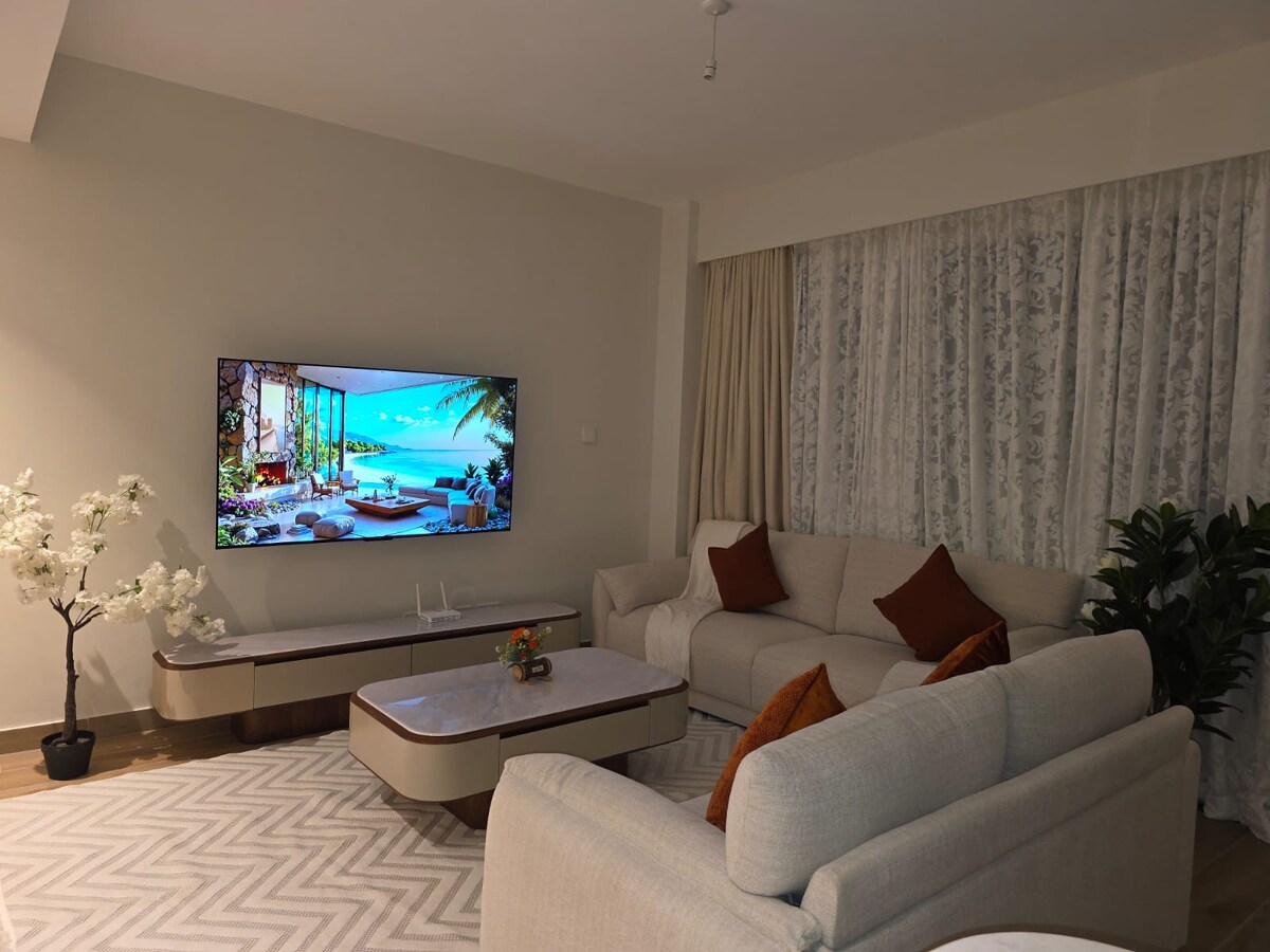 Bo noen skritt fra stranden i denne raffinerte toppleiligheten med havutsikt i Nyali, designet for privatliv og nytelse. Den har tre romslige soverom med eget bad og smart-TV, inkludert en rolig hovedsuite med privat balkong, gyngestol og jacuzzi. Nyt en stilig stue med JBL-lyd, et fullt utstyrt kjøkken, klimaanlegg, heis, backup-strøm, sikkerhet døgnet rundt og et felles svømmebasseng.