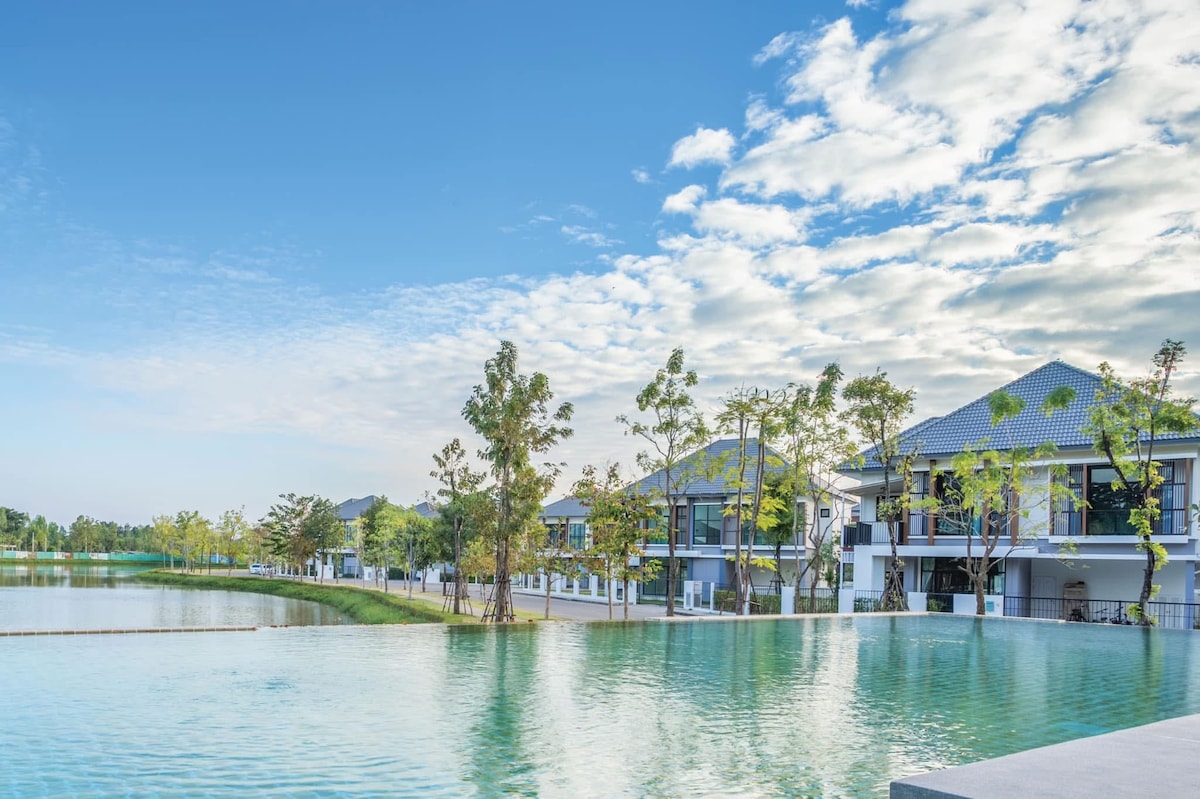 ***Røykfri eiendom*** Rækkehus ved siden av innsjøen Kaen Nakhon. Bestilling av 1-4 gjester har tilgang til to soverom. Bestilling av 5-6 gjester har tilgang til 3 soverom. 3 soverom/3 bad. Plass til 4-6 personer Ligger i et trygt og rent område med felles svømmebasseng, tilgjengelig for gjester. Nær restauranter, kaféer, templer og park.