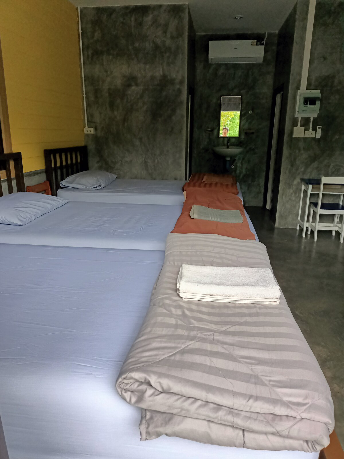 Det er totalt tre soverom med totalt tre soverom, soveplass til ti personer, to bad. Huset vårt ligger på Magic Road, kul er lett å komme seg til, 1,1 kilometer fra togstasjonen, 5 minutter med bil eller 15 minutters gange, 5,8 kilometer fra flyplassen, 15 minutter med bil, huset ligger ved siden av parkeringsveien foran huset. Det tar bare 40 minutter (40 km.) fra huset til Pakmeng Pier. Huset vårt ligger i nærheten av mat og marked. Du kan spasere til morgenmarkedet for en billig, autentisk Trang måte å spise middag på kvelden. Du kan spasere til et loppemarked eller en restaurant i nærheten, eller slappe av med en massasje i hjemmebutikken, mandag, en sunn massasje.