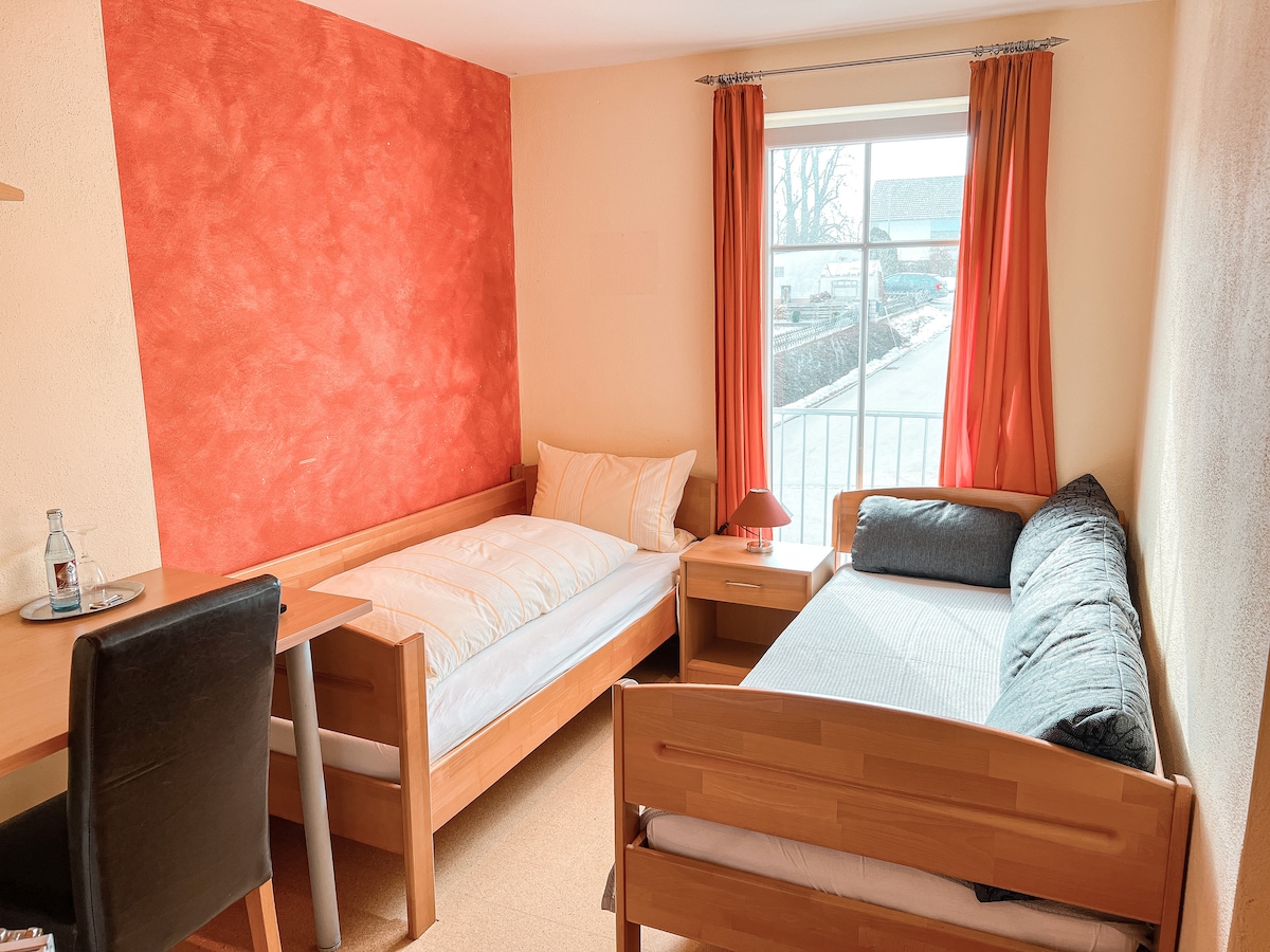 Rommene våre ligger midt i landsbyen Steinakirchen. I umiddelbar nærhet er butikker, banker, vertshus, apotek, frisør, ... I selve huset er det en restaurant/pizzeria. Det er rikelig med privat parkering ved siden av "Green Tree" eller på motsatt side av gaten. Besparelsesmarkedet i nærheten har en liten bistro hvor du kan spise frokost.