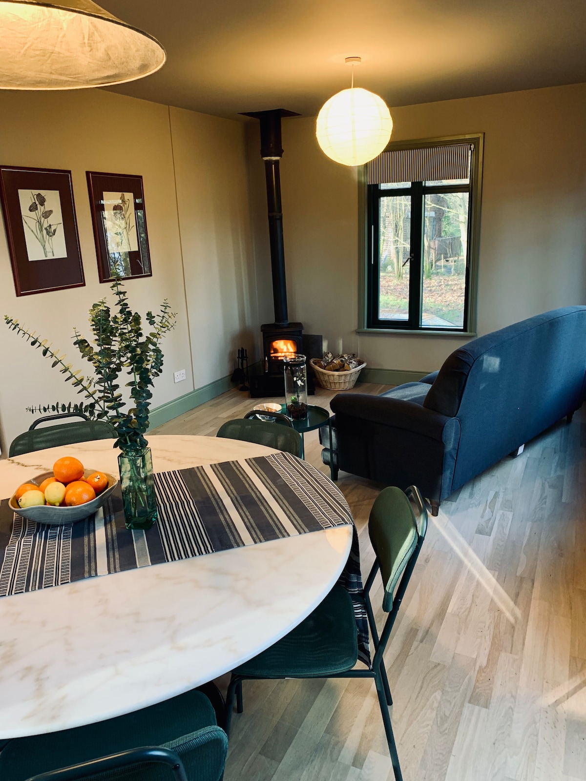Du vil elske denne romantiske ferien. Denne vakre hytta bygget i leire, som ligger i enden av hagen vår, er koselig og annerledes. Hytta har sin egen finurlige hage og en terrasse rundt hele huset hvor du kan slappe av i boblebadet (februar–november) med utsikt over landskapet eller lage mat på utekjøkkenet. Stuen i åpen planløsning inne i hytta er fortryllende med de runde vinduene , glassflaskeveggen, spolsofaene og skreddersydd eikekjøkken og en komfortabel dobbeltseng. Sentralvarme .
