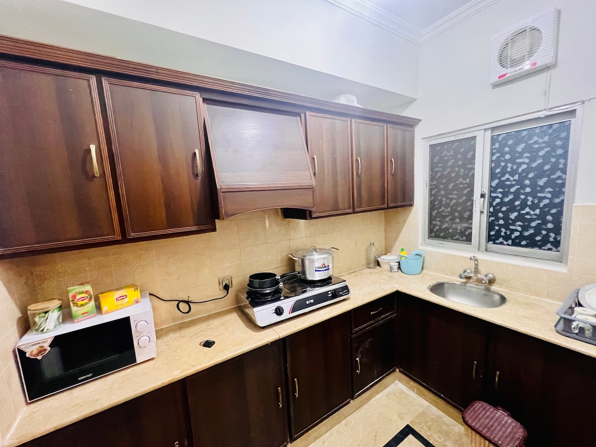 Velkommen til @blueoakresidences Romslig leilighet på 1500 kvm i F-11/1 Islamabad med to soverom med eget bad og privat balkong, toalett, UPS-backup, raskt trådløst nettverk, innsjekking uten vert og en 58" smart-TV. Kjøkken, varmt vann, gratis parkering og heis døgnet rundt er inkludert. For grupper større enn fire, er det to ekstra gulvmadrasser for opptil seks gjester. Babyseng er tilgjengelig ved forespørsel for tre eller flere netter (5000 PKR). Trinn fra Loafology, Nando's, Asian Wok, KFC, Al-Fatah. Familievennlig park rett utenfor.