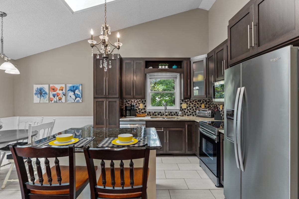 Slapp av på dette moderne feriestedet med tre soverom – nyoppusset og gjennomtenkt møblert. Hjemmet er perfekt for familier, venner eller jobbreiser. Strøm favorittprogrammene dine på Ultra HD Smart TV-er, lag mat i et fullt utstyrt kjøkken, og nyt spill og bøker for alle aldre. Slapp av ute i den inngjerdede bakgården med grill og komfortable sitteplasser. Vi har en sentral beliggenhet – bare 14 minutter til Wrightsville Beach og 13 minutter til sentrum. Du er i nærheten av alt mens du nyter komfort, stil og plass til å slappe av.