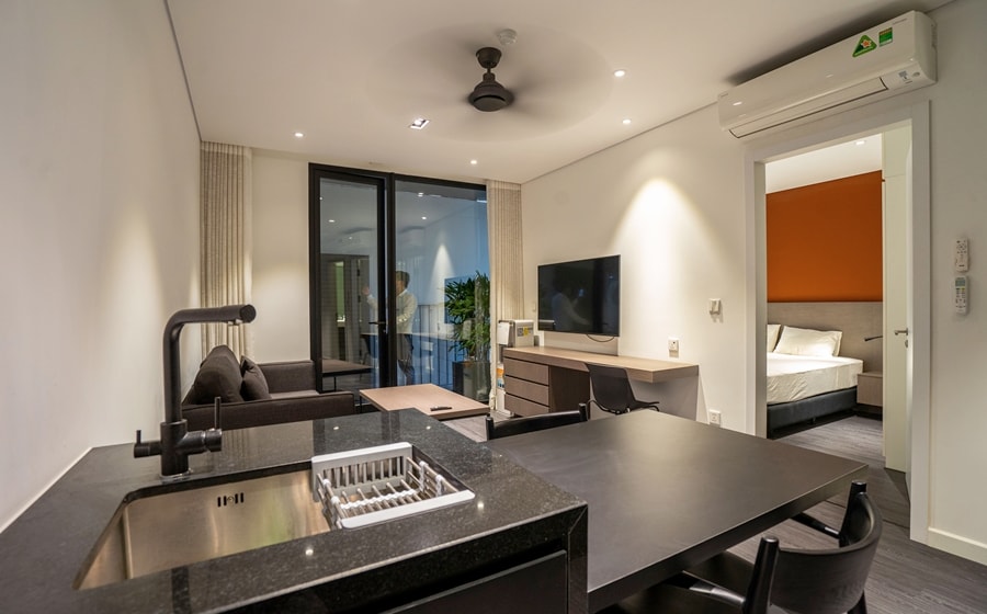 Denne vakre leiligheten i Tay Ho ligger i sjette etasje i den nye bygningen vår – Hanoi Housing 32. Den har ett soverom, ett bad og en åpen stue/kjøkken. Den er pent designet. Fullt moderne møbler og utstyr er inkludert. Tregulvet gjør leiligheten enkel å rengjøre. Dessuten ligger bygningen innenfor gangavstand til dagligvarebutikker, restauranter, butikker, barer og puber. Vær oppmerksom på at det ikke er naturlig lys eller balkong i leiligheten.