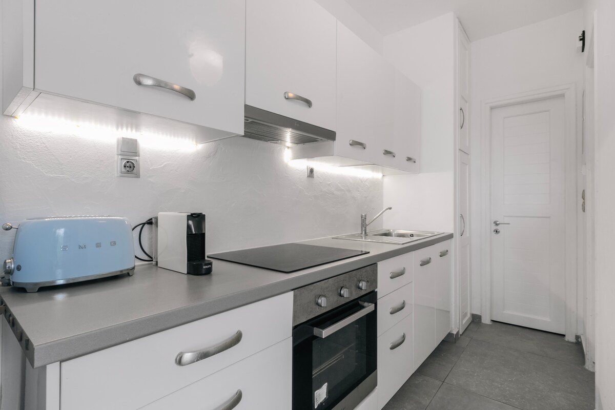 Det er en helt ny studioleilighet, i sentrum av gamlebyen, CHORA, med en utmerket utsikt over sjøen. Den ligger mellom restauranter, kaféer og de mest berømte klubbene.