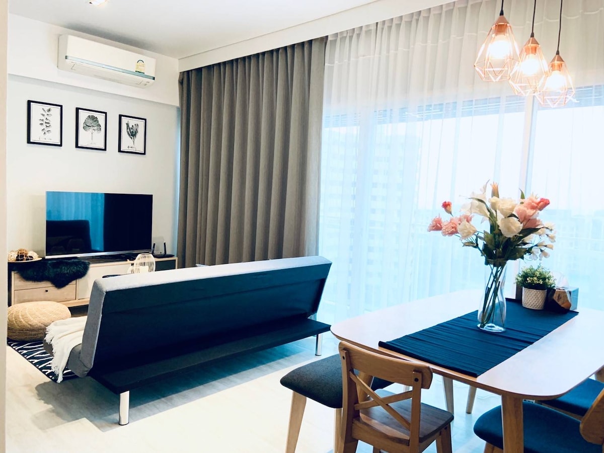 Lys og luftig 150 kvm duplex-leilighet med tre soverom ved stranden, basseng på taket, fullt kjøkken, åpen planløsning, trådløst nettverk, to smart-TV-er koblet til internett. Valgfri privat sjåfør/turguide, henting på flyplassen tilgjengelig. Nyt vakre solnedganger og fantastisk utsikt på de to balkongene med lyden av bølgene som slår inn på stranden fra fjerde og femte etasje, eller fra bassenget på taket i åttende etasje direkte til stranden. Plassert i en rolig fiskerlandsby 25 minutter fra Pattaya by.