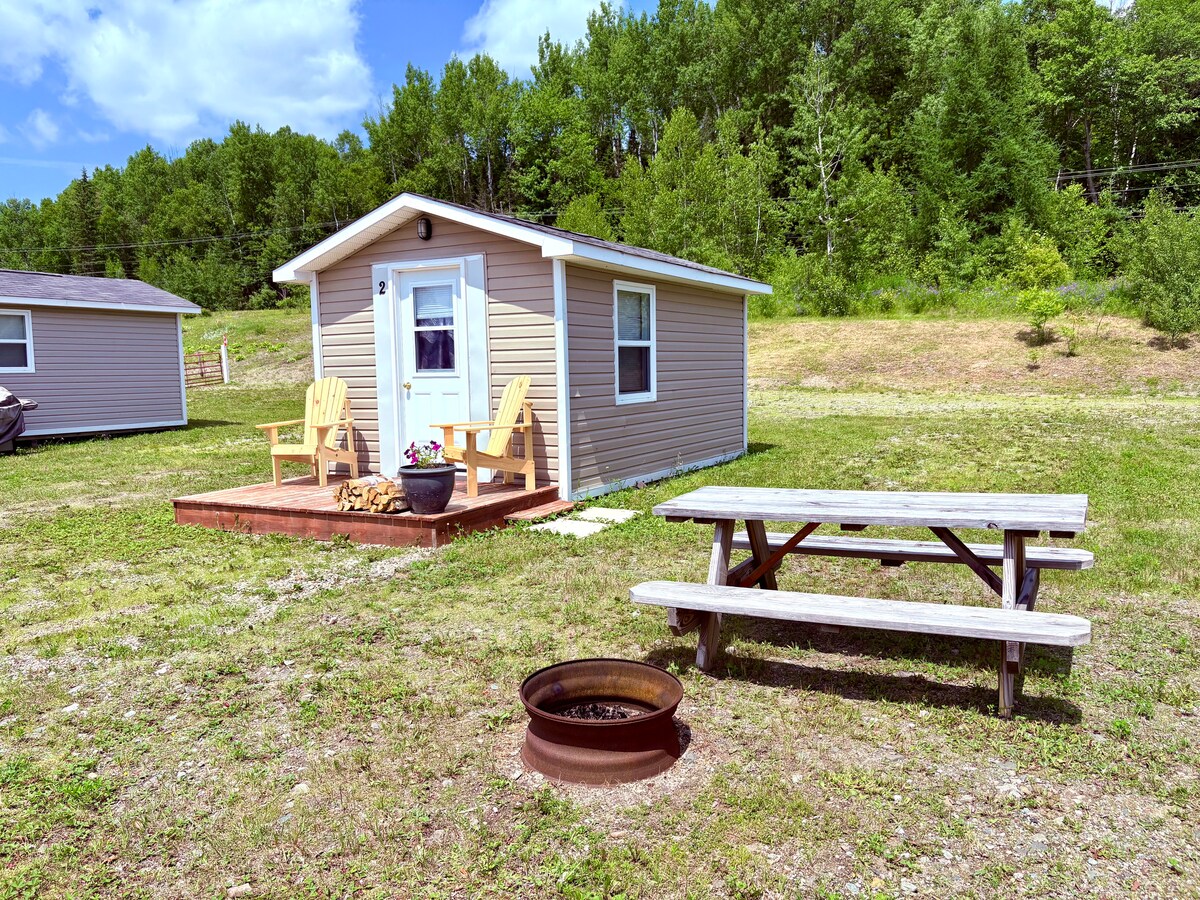Fullt utstyrt alle årstider, to soverom med én luksus-dobbeltseng i hvert, dusj, kjøkkenapparater i full størrelse. Privat, lukket boblebad, dampsauna, kald dusj utendørs/åpner igjen våren 2026, veranda med netting. Bålplass med ved. Vi tilbyr alle fasiliteter du trenger for å ha et fantastisk opphold. Sesongbruk av grill og snøsko. Turgåing, sykling ATV/sledestier, fosser, håndverksbryggeri, butikker, restauranter og Crabbe Mountain i nærheten. Fantastiske solnedganger ved den praktfulle Saint John-elven.