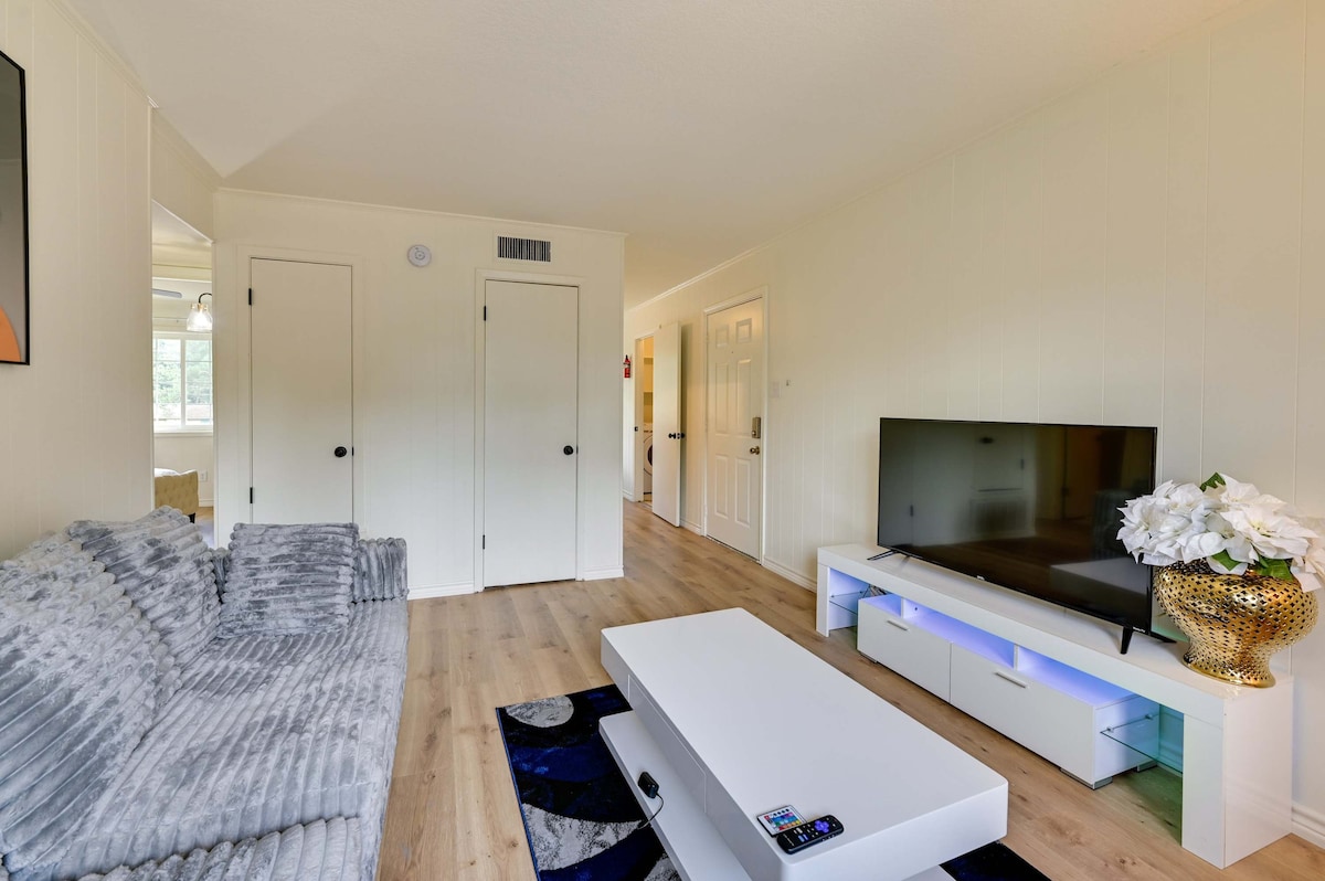 Leilighet med to soverom og to bad. To store garderoberom. Fullt kjøkken/spiseplass, vaskemaskin/tørketrommel. Alt er levert for korte opphold. Basseng på stedet. Det er lokale kanaler, YouTube TV, NFL, CNN, Fox News og mange andre direktesendinger tilgjengelig via ROKU smart-TV. Det er en Keurig-kaffemaskin for én porsjon. Du er velkommen til å logge inn på alle strømmetjenester ved hjelp av din egen konto.