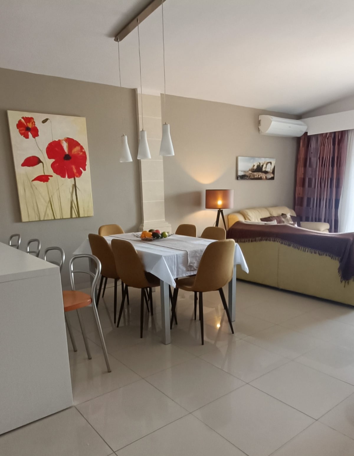A large sunlit apartment in Nadur center. Easily reached by bus from Ferry Terminal. Coffee shops, restaurants, bakery + grocery shops nearby. Lovely kitchen equipped includes coffee, tea, oil & more. The bathroom has a tub/shower + free use of a washing machine. Front balcony and back terrace. Gas heater and dehumidifier which helps stabilize air. New comfortable mattress for a good nights rest. Beautiful panoramic view of the islands just around the corner. Best value apartment on the island!