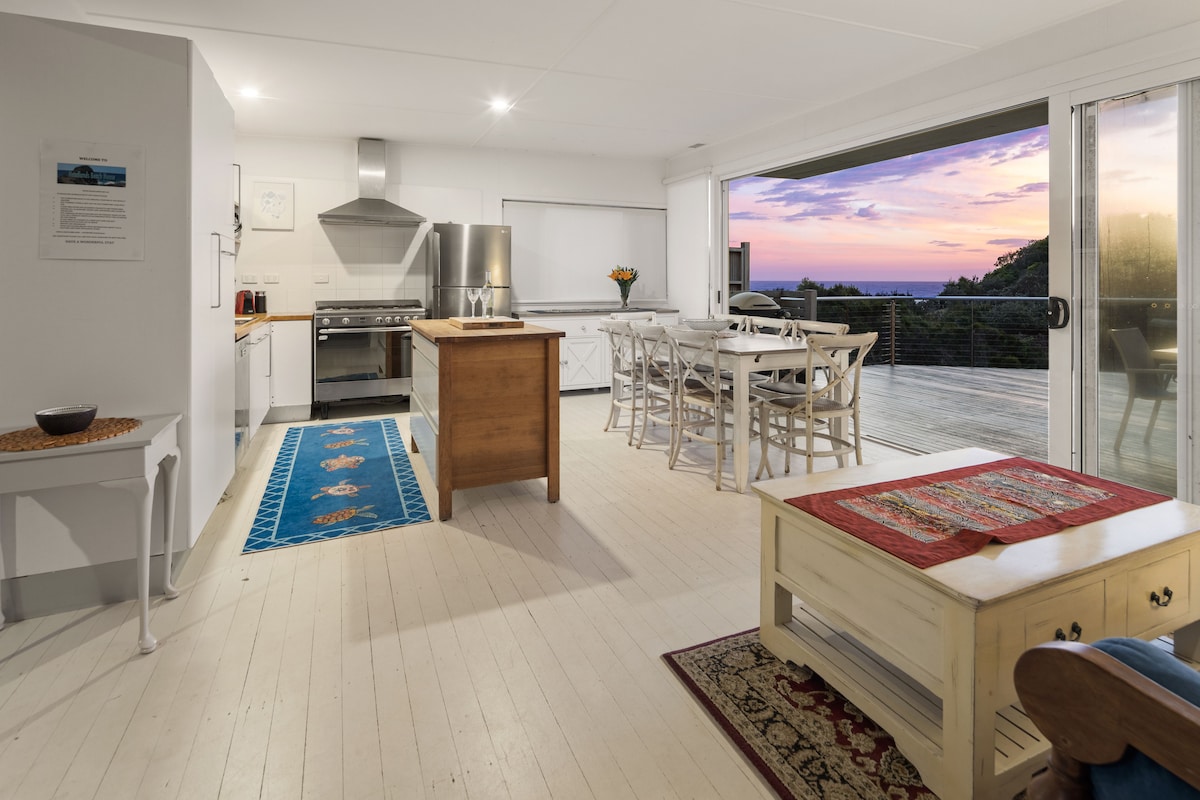 Komfortabelt og romslig hjem i åpen planløsning, i eldre stil med stort familiekjøkken og fantastisk utsikt over havet og innlandet. Romantisk soverom med kingsize-seng, eget bad og privat veranda, perfekt for par. Også ideelt for familieferier med eget barneområde og en ekstra TV/DVD. Alt sengetøy er inkludert. Trådløst Internett og Netflix. Inngjerdet hage, kjæledyrvennlig, fem minutters spasertur eller en kort kjøretur ned til stranden. Fliser overalt. Kjæledyr er velkomne, teleskop for hvalkikking. Full refusjon hvis du må kansellere.