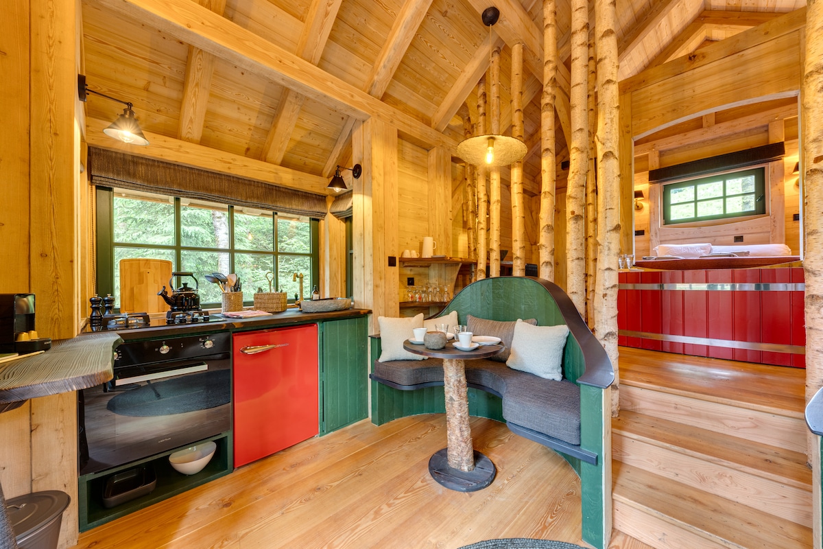 Nichée au cœur d’une forêt de bouleaux, la Cabane de Marc offre un univers doux et coloré. Profitez d’une terrasse avec baignoire en bois rouge et coin repas. À l’intérieur, un salon chaleureux avec feu ouvert, une cuisine charmante et une étonnante rangée de bouleaux qui sépare l’espace nuit. Le lit et la baignoire intérieure offrent une vue imprenable sur la nature pour une immersion totale.