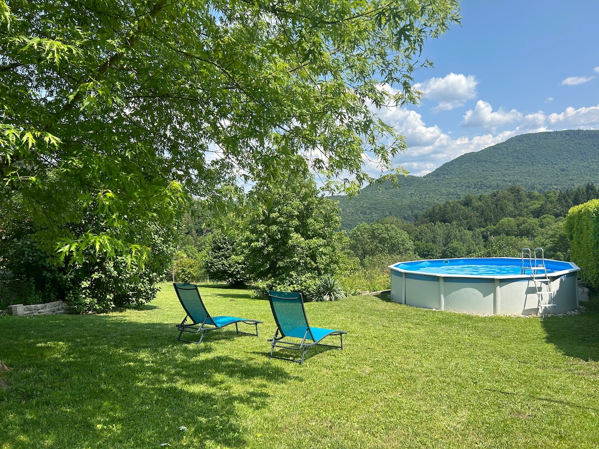 Ermitasjen i Meyriat I utkanten av Meyriat statsskog – en region som ofte beskrives som «lille Canada» på grunn av naturens skjønnhet, i nærheten av ruinene med samme navn og de brune dammene, i sentrum av turstier, gjør det til det ideelle stedet for et idyllisk opphold. Hus med mye sjarm, ideelt plassert for et velvære- og naturopphold Semi-frittliggende hus på den ene siden.
