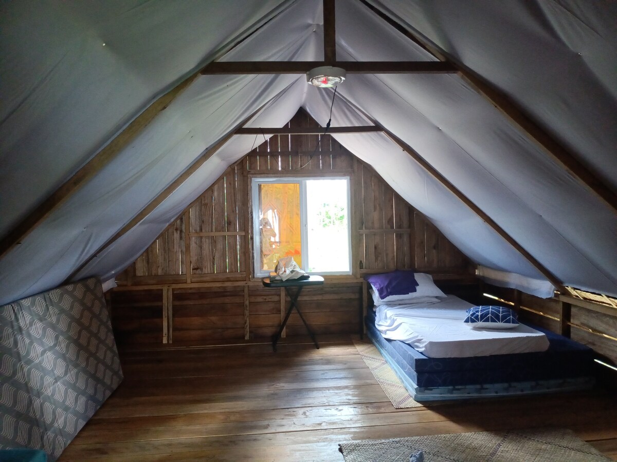 Et fredelig strandhus med en vakker utsikt over øya, skjult i en liten by på landsbygda i Berong i Quezon Palawan. Minutter unna en fantastisk foss og noen få skritt unna en rolig og vakker strand. La bølgene ta bekymringene dine bort og la den vakre solnedgangen male himmelen i nyanser av rav og rose, mens kokostrærne svaier forsiktig i kveldsbrisen. Våkn opp til lyden av bølger som forsiktig krasjer mens soloppgangen søler flytende gull over horisonten.