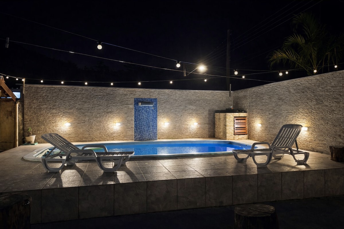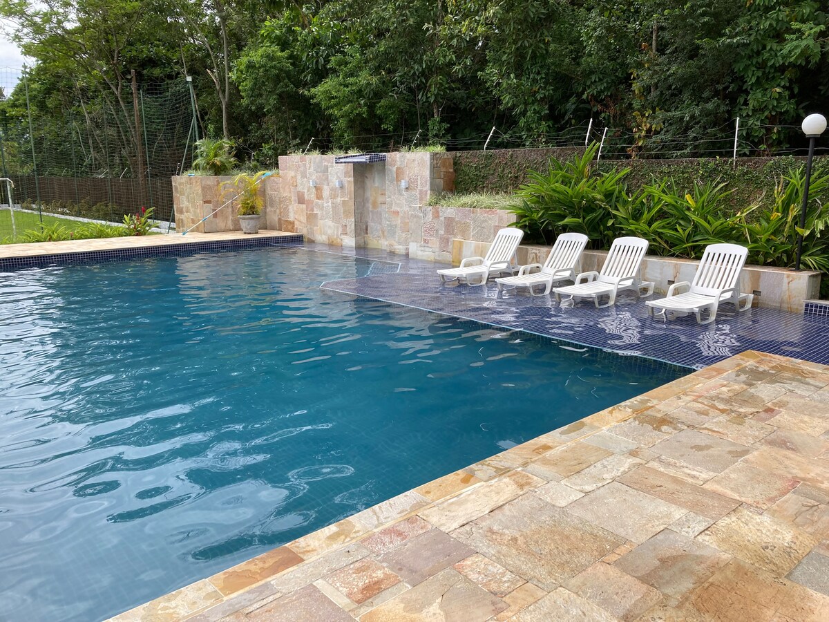 Huset har en høy høyre fot, forlater huset godt ventilert, alle rom med takvifter,stort uteområde med barneleketøy, et lite hus med sklie, stor grillplass, stort basseng Huset ligger inne i en inngjerdet leilighet med sikkerhet, omgitt av vegetasjon, atlantiskog, et koselig og hyggelig sted, sikkerhet og ro.