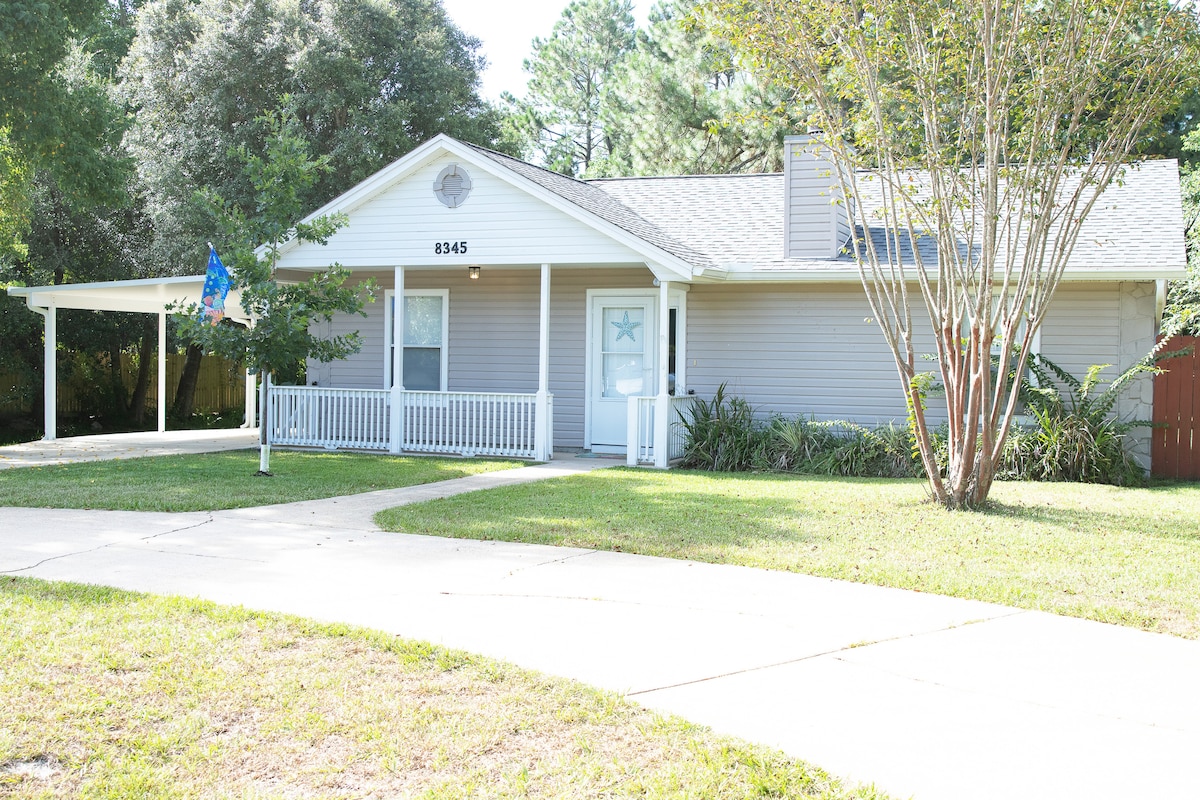 Velkommen til strandferien din! Vakkert hus innenfor gangavstand (1,5 miles. 1,2 miles er å gå over veien med beskyttede stier på hver side) til den sukkeraktige hvite sanden på Navarre Beach, bølger fra Navarre-lyden, mange restauranter og mer! Fasiliteter i massevis! To overbygde terrasser for avslapning, bålplass for koselig avslapning om kvelden og en skjermet veranda sammen med utendørsbelysning. Nyt en sykkeltur til stranden eller en slumring i hengekøya i bakgården på slutten av dagen. Rom for seks personer.