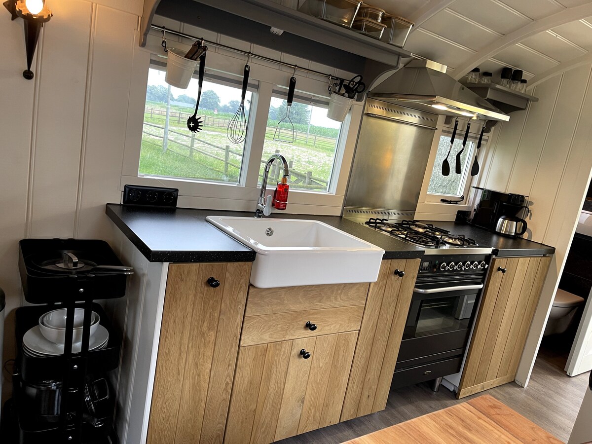 Dette Pipowagen / Tiny-huset er utstyrt med; sentral (gulv) oppvarming, (delt) Airco, oppvaskmaskin, Boretti-komfyr, kaffemaskin, stor terrasse med Kamado BBQ, elektrisk justerbar Auping-boksfjær 140 x 210 cm, interaktiv TV, Netflix, Wifi, senge- og badetekstil og Rituals-produkter. 1 eller 2 elsykler for 15,-/ dag. 1 eller 2 elsykler for 30,- / dag Beliggenhet midt i det grønne mellom Herikerberg og borkeld/frienberg. Vandring / sykling; Fjellsykkelrute på 100 meter.
