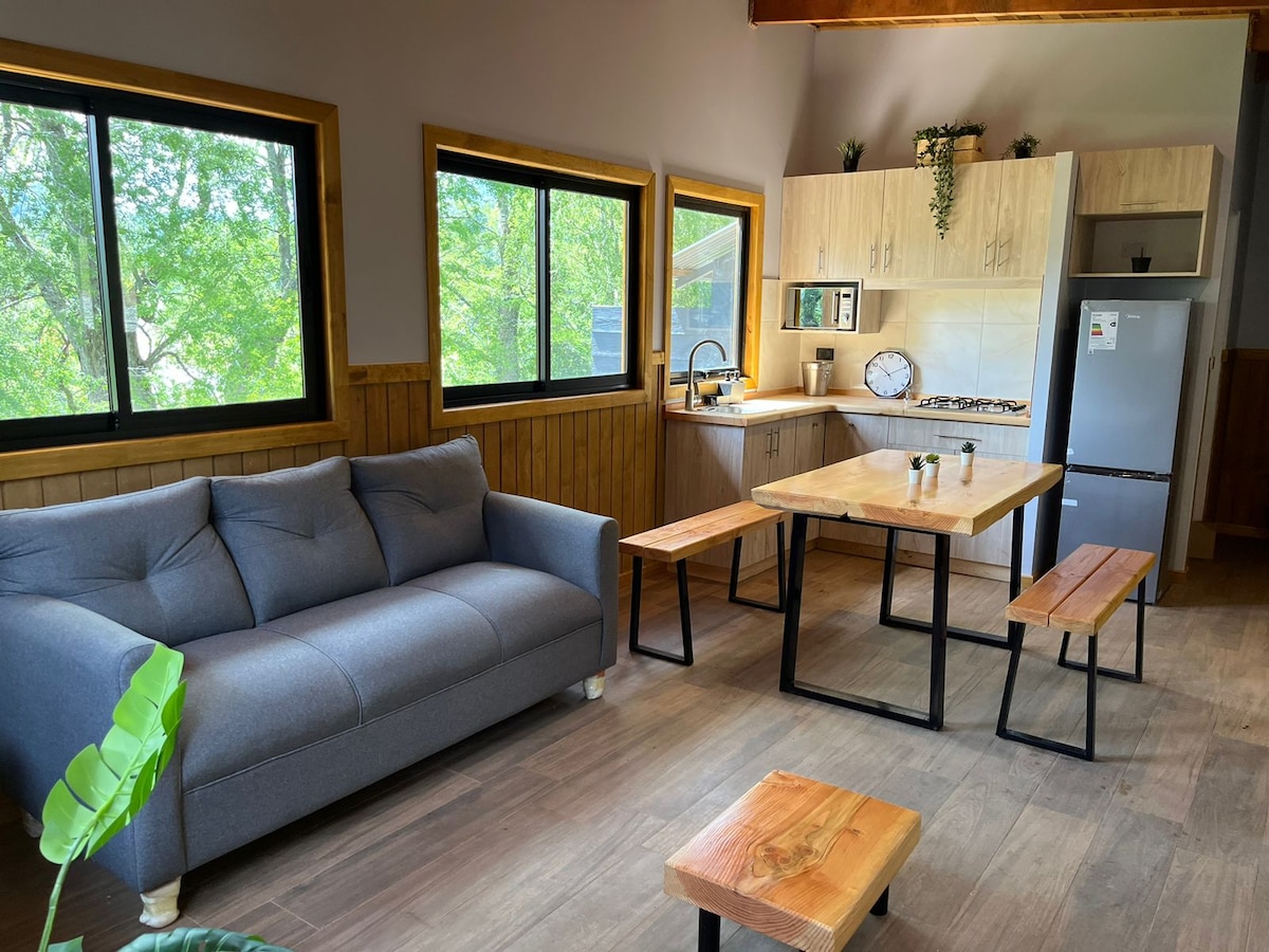 Slapp av i dette friske, elegante, moderne og naturlige rommet. Fullt utstyrt og uten tilleggskostnader. Plassert i et anerkjent kondominium med sikkerhet døgnet rundt. Dette Tiny House er det du har lett etter for å kunne hvile deg i naturlige omgivelser, med en utmerket utsikt over vulkanen Ruka Pillan (Villarrica). Vi ligger bare 10 minutter med bil fra byen Pucón, 20 minutter fra Villarica, 30 minutter fra varmebad, skisenter og nasjonalparker. Spør oss for mer informasjon. Lev i Araucanía!