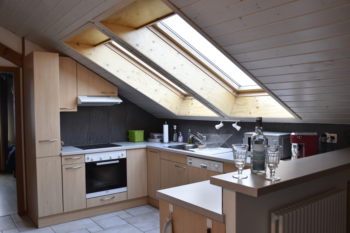 Velkommen til "Es Guinchets", en fredelig og varm bolig, ved naturens dør. Denne store loftsleiligheten på 125 m2 ligger i øverste etasje i et hus på to nivåer, og er tilgjengelig med heis. Beliggende i et rolig nabolag i utkanten av landsbygda i Domdidier, er denne koselige leiligheten et ideelt utgangspunkt for mange utflukter (Murten og Trois Lacs-regionen, Fribourg, Bern, Lausanne, Neuchâtel).