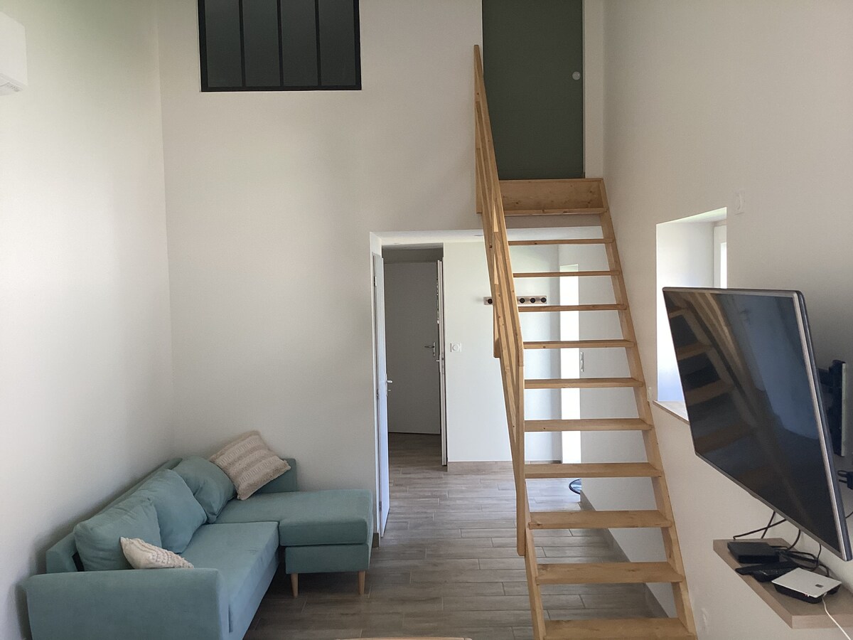 Enten du er sammen med familie, venner eller på forretningsreiser (for å redusere kostnadene). Vi ønsker deg velkommen til vår renoverte gårdsbygning. Plassert i en rolig blindvei uten naboer som kan se inn. Leilighet med to soverom, stue utstyrt med et ekte snookerbiljardbord, bar, dart og brettspill, bokhylle og lesekrok. Ute finner du et uoppvarmet svømmebasseng som er åpent fra april til september, en petanque-bane og et bordtennisbord. Én terrasse med utsikt over bassenget og én med utsikt over gårdsplassen. Sikker parkering.