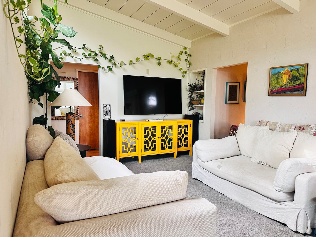 ☀️ To kvartaler fra Lake Tahoes North Shore 🛶 Gratis tilgang til kajakker, padlebrett, redningsvester, vogn og campingstoler. 🏕 Fullt ombygd 3BR Mid-Century A-ramme 🍳 Gourmetkjøkken med Wolf Range + førsteklasses apparater + fullt utstyrt krydder 🌲 Privat terrasse og bakgård for uteservering og avslapning 🔥 Koselig stue med peis for kule Tahoe-kvelder 🎿 11 miles til Palisades Tahoe, Alpine Meadows og Northstar Bestill din uforglemmelige sommerferie i Tahoe i dag!