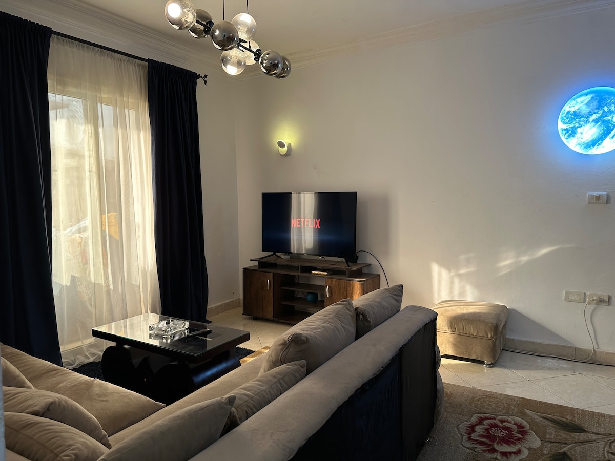 Leiligheten ligger i andre etasje med enkel tilgang til trappen. (Ingen heis) Den romslige og sentralt beliggende leiligheten min i New Cairo er stilig og ideell for både forretnings- og fritidsopphold, innenfor gangavstand fra restauranter og kaféer som KFC, italienske, asiatiske og arabiske restauranter. Nær alle viktige fasiliteter, inkludert treningssentre, spa, helsesentre og kjøpesentre i New Cairo. Førstevalget for familier, par og profesjonelle som leter etter en Airbnb i New Cairo, Kairo, Egypt.