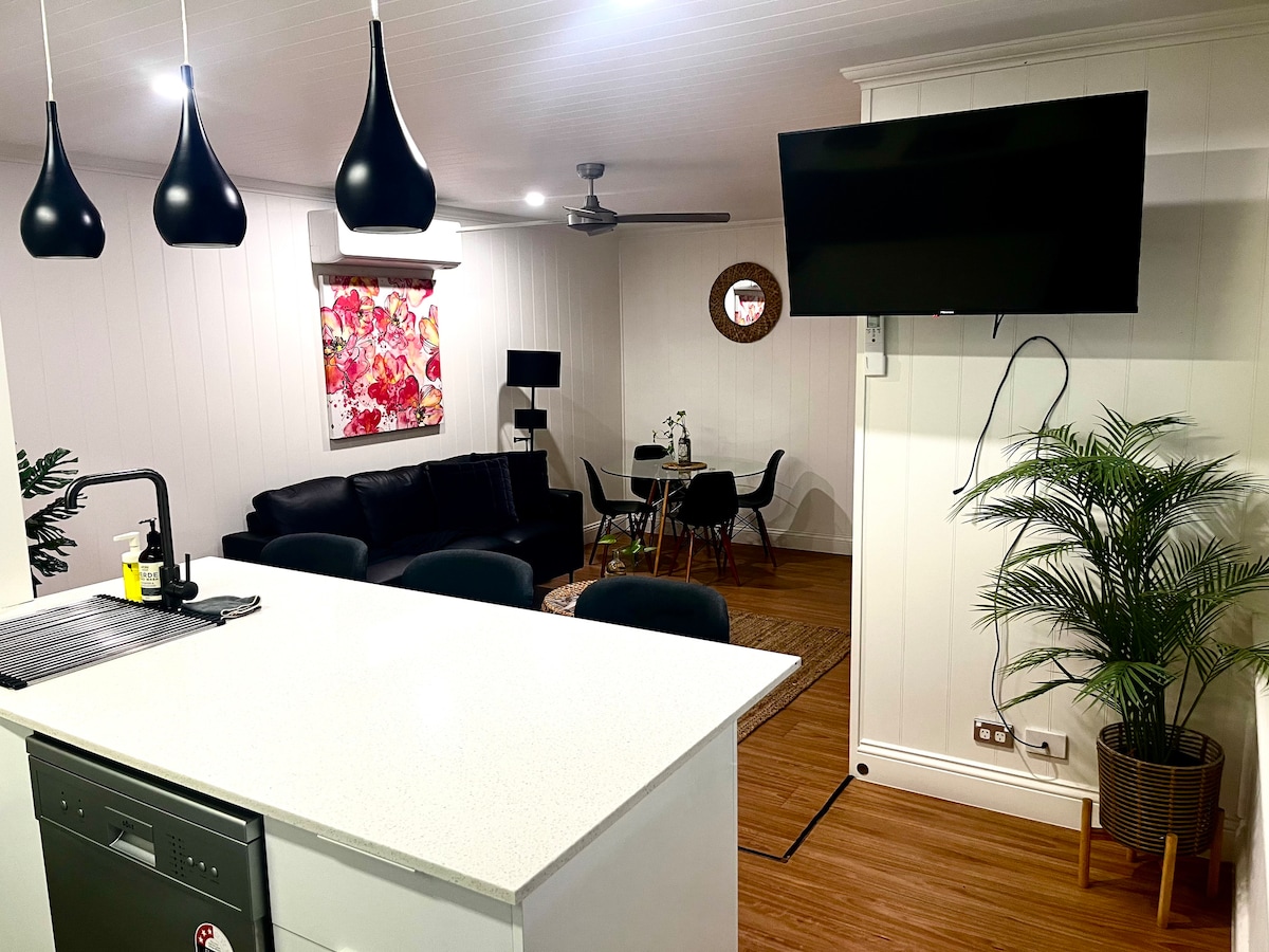 Perfekt for bedrifts- eller fritidsreiser. Ligger ved James St, skjult under min Q'Lander, røykfri leilighet med én seng, fullt utstyrt kjøkken, overdådig bad, solrom og romslig queen B'rom. Takvifter, aircondition, to smart-TV-er, vaskemaskin og tørketrommel. Be om at arbeidsstasjon og ergonomisk stol settes opp. Gå til HSW, NF Park, Powerhouse, buss til City, Valley eller City Cats. Tilgang: gå ned innkjørselen som er skjult i garasjen. Solsystem i solrommet og klær kan være på tørk. Én hund. Ingen katter, ingen røykere.