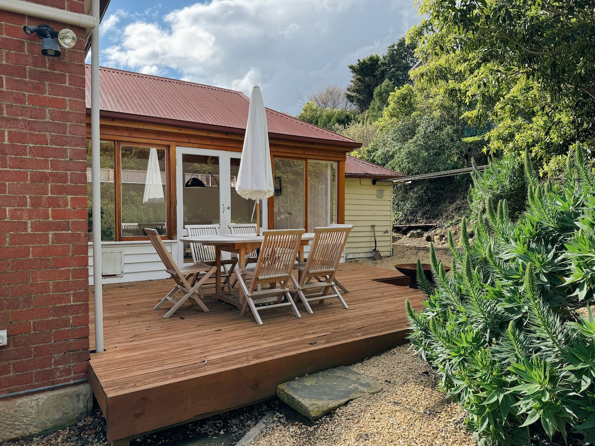 Lyst hus med solrik terrasse i en vakker privat hage. Moderne kjøkken, koselig stue, vedbrann, tre soverom, spillrom, vaskerom, bad og uteservering. 4,5 km til Hobart CBD, Salamanca-markedet og MONA-FERGEN. 19 km til flyplassen. Kort spasertur til elven Derwent, Royal Botanical Gardens, Cornelian Bay & Domain. I nærheten av lekeplasser, kafeer, restauranter og kjøpesenter. Gratis parkering utenfor gaten, raskt internett og trådløst nettverk, smarthøyttaler, Netflix, Prime, Kayo og Disney. Innenfor Hobarts scootersone.