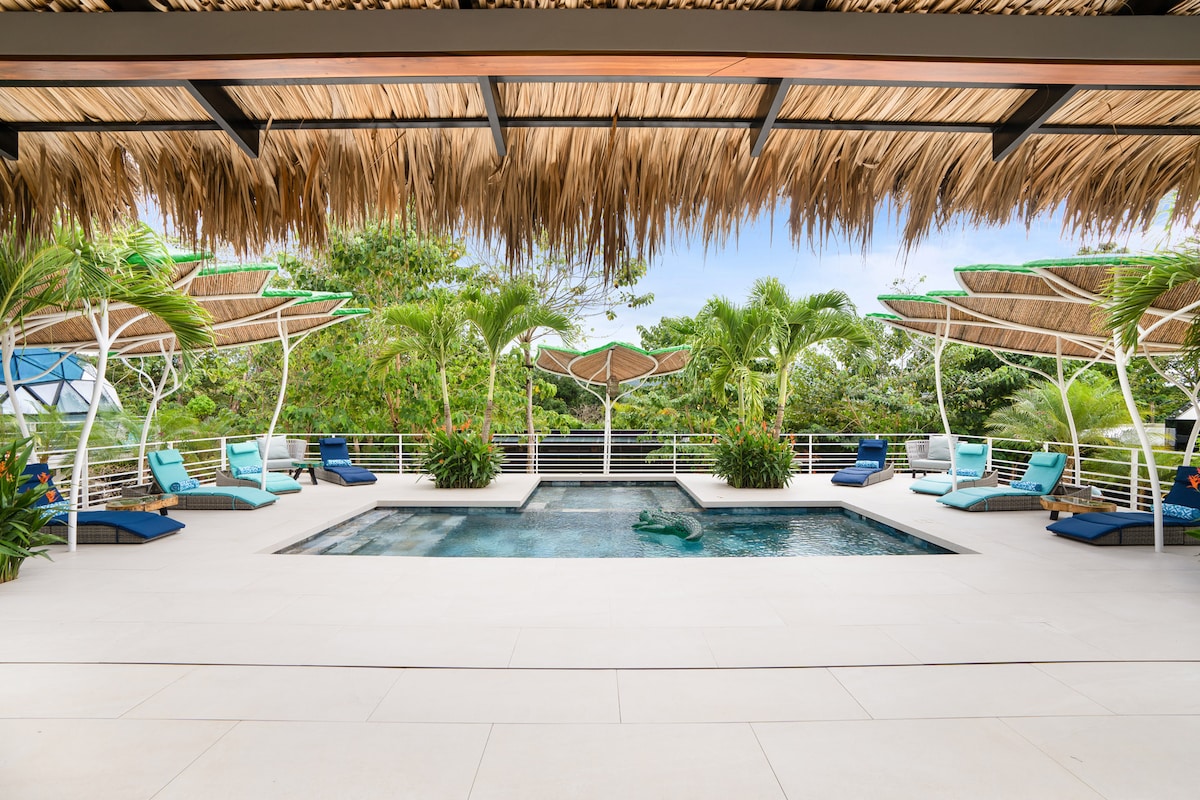 Velkommen til din private Geo-kuppel, komplett med et boblebad for kvelder under stjernene, et solterrasse med solsenger og et kjøkken for hjemmets bekvemmeligheter. Du er bare minutter unna tre strender i verdensklasse, lokale spisesteder og endeløse eventyr i Potrero i Costa Rica. På Blue Ridge Resort kan du nyte concierge-tjenester, bestille en avslappende massasje eller utforske fasilitetene på feriestedet (basseng, spillrom, fuglereservat, rekreasjonsaktiviteter) bare noen skritt fra døren din. Din Costa Rica-ferie starter her.