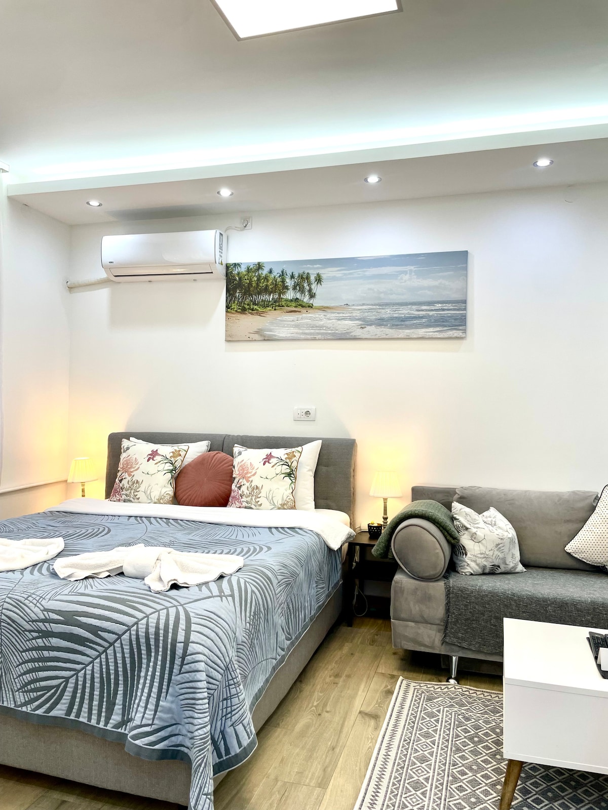 Leiligheten er totalrenovert for noen måneder siden, og alt er helt nytt. På soverommet er det en stor komfortabel dobbeltseng og en stor sovesofa i stuen. Alt i diskret LED-lys. På kjøkkenet kan du nyte en moderne flatskjerm komfyr, stekeovn, kjøleskap med fryser, oppvaskmaskin og vaskemaskin og et stort barbord. Badet er innglasset med marmorkeramikk. Det er veldig kompakt og rent. Badet er utstyrt med hårføner, håndklær, hygiene sett.