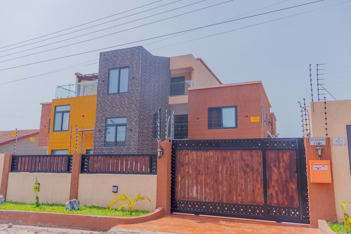 Ligger i Serene Gated Community i Tema (TDC Affordable Housing, Community 26). Et fredelig og sikkert sted å bo. Perfekt for helge- og ukedager, bryllupsreise, jobb hjemmefra, familiegateways 🥳🥳 osv. Fem (5) minutters kjøretur til Palace Mall Comm 25, Tema free zone, Devtraco Estate og Environs. 1. Enkel tilgang til kjøpesenter 2.24/7 vann og elektrisitet 3. Barn Lekeplass. 4.Gratis bilparkering 5. TRÅDLØST NETTVERK med høy hastighet. 6. DSTV /75" TV 7.Netflix 8. 20 minutter med bil fra Accra lufthavn.