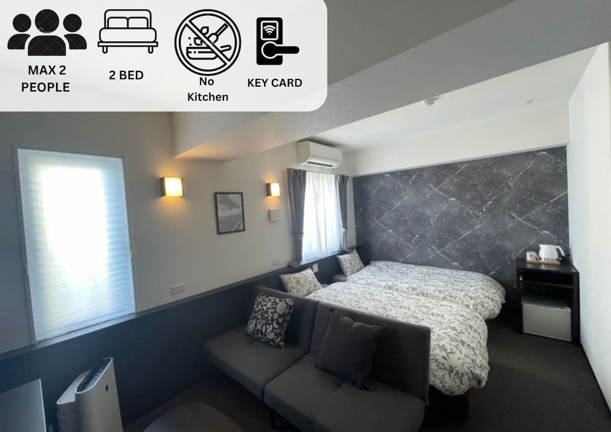 Semi-selvbetjent hotell for privat innkvartering Det er utstyrt med det nødvendige. Vi tilbyr ikke rengjøring eller bytte av sengetøy og håndklær under oppholdet, men prisen er rimelig. Rom for to personer. 20 m² Det er to enkeltsenger og en sofa. Det er også et garderobeskap, så du kan oppbevare kofferten din. Inngangen er låst automatisk. Du bruker et nøkkelkort. Innsjekking starter kl. 15.00. Utsjekking er til kl. 10.00. Det er ett minutts gange fra Nankai Shin-Imamiya stasjon og JR Shin-Imamiya stasjon til utleiestedet. Det ligger rett ved siden av stasjonen. Det er 5 minutter å gå fra T-banestasjonen Zoo-mae til utleiestedet. 40 minutter direkte fra Kansai lufthavn. Ingen bytte. Det er ca. 10 minutter å gå til Shinsekai-området og Tennoji-området. Det tar ca. 15 minutter med tog til Namba (Dotonbori) og Shinsaibori. Det tar ca 25 minutter med tog til USJ. (1 bytte) Det tar omtrent en time med tog til de ulike turiststedene i Kansai (Kyoto, Nara, Kobe). I nærheten finner du supermarkeder, nærbutikker og apotek. Håndklær kan byttes mot et gebyr (krever forhåndsbestilling) Bagasjeoppbevaring er mot betaling (krever forhåndsbestilling) Tidlig innsjekking og sen utsjekking er mot betaling (krever forhåndsbestilling)