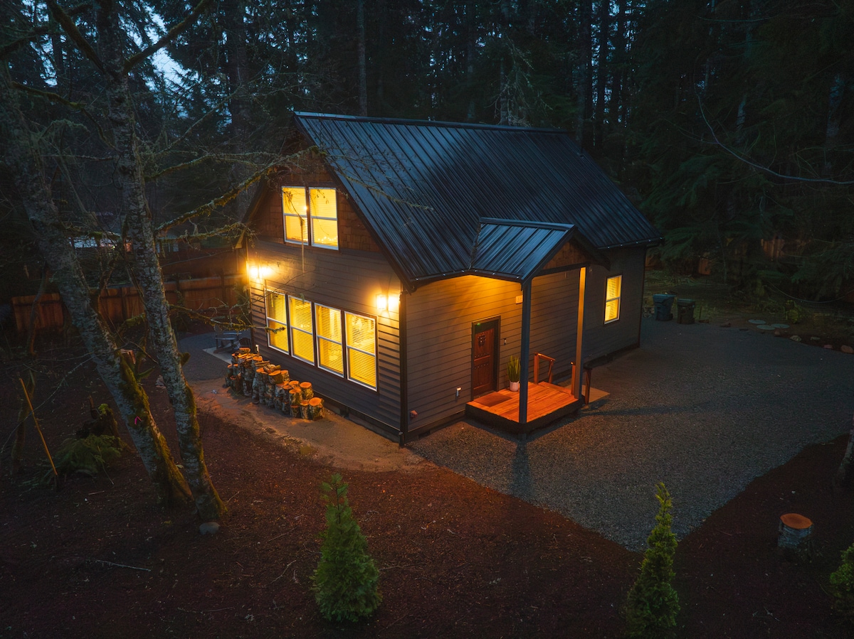 Privat. Fredelig. Romantisk. Utformet for uforglemmelige ferier. Flykt til din egen avsidesliggende spa-hytte bare minutter fra Mount Rainier nasjonalpark. Etter en dag med eventyr kan du gå tilbake til det private boblebadet, den skreddersydde saunaen i sedertre og bålplassen under skogens løvtak. Gjennomtenkte detaljer, koselig belysning, et fullt utstyrt kjøkken, kaffebar, spill og strømming gjør det enkelt å finne seg til rette og bli en stund. Mange gjester kommer tilbake år etter år for jubileer, bursdager og rolige omstarter!