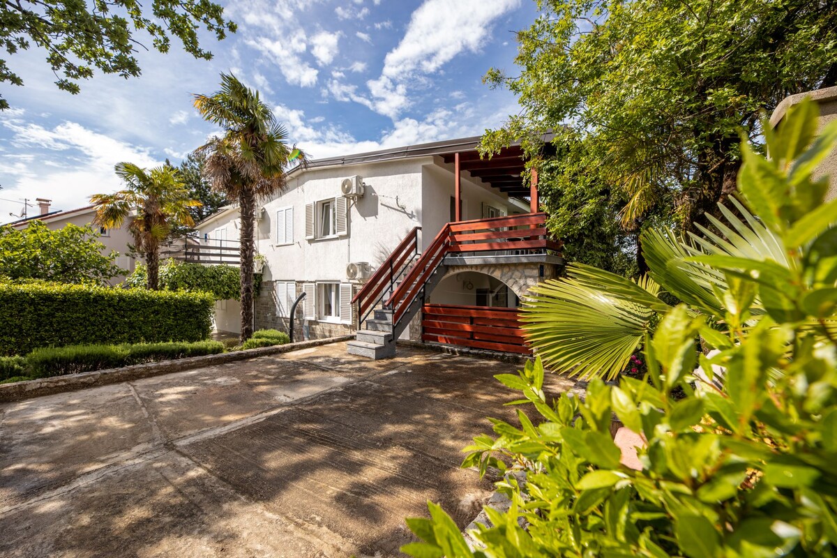 Leiligheten ligger i andre etasje med en stor terrasse som har uhindret utsikt over Kvarnerbukten. Du kan nyte denne spektakulære utsikten fra spisestuen, soverommet og det andre soverommet. Stranden ligger bare 200 meter unna. Leiligheten består av: Hovedsoverom med komfortabel queen size-seng. Det andre soverommet har to enkeltsenger og et skrivebord. Kjøkken med spisebord. Bad Terrasse og balkong. Én parkeringsplass og trådløst nettverk er tilgjengelig og gratis å bruke.