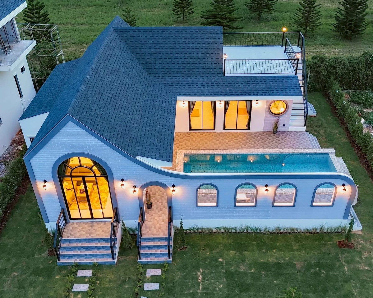 bassengvilla med stort tak, tre soverom, fire bad, to stuer, to spisebord, stor sofa, LED65-tommers TV, rom med utsikt over fjellet, flott utsikt. Har et basseng med et jaguzzi-bad og et basturom med en thailandsk familie nedenunder med en kjøkkeninnretning Plassering i nærheten av Toscana. Så de kom gjennom den store fjellparken, praktisk, sikker, med 24/7 sikkerhet.