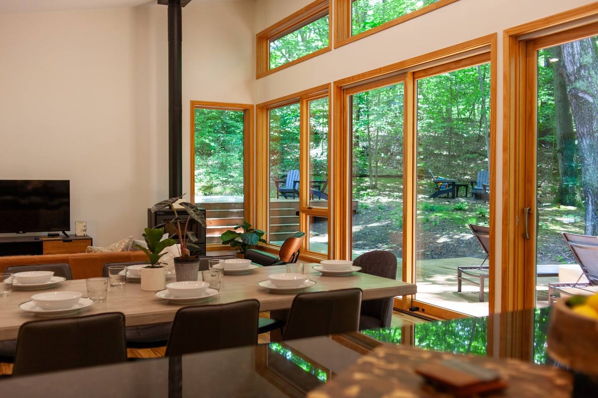 Slapp av i komfort i dette fantastiske, moderne hjemmet som ligger i vakre, skogkledde omgivelser. Utsikt over majestetiske trær og naturlig lys som strømmer inn i interiøret. Nyt peisen inne/ute og slapp av i boblebadet, underhold gjester og grill på terrassen bak huset og slapp av ved bålplassen i bakgården. Lag mat på det godt utstyrte kjøkkenet. Spillerommet har biljardbord og bordtennis i en oppvarmet garasje. Unn deg denne unike ferieopplevelsen få minutter fra Saugatuck, strendene ved Lake Michigan og vinområdet Fenn Valley. Hundevennlig.