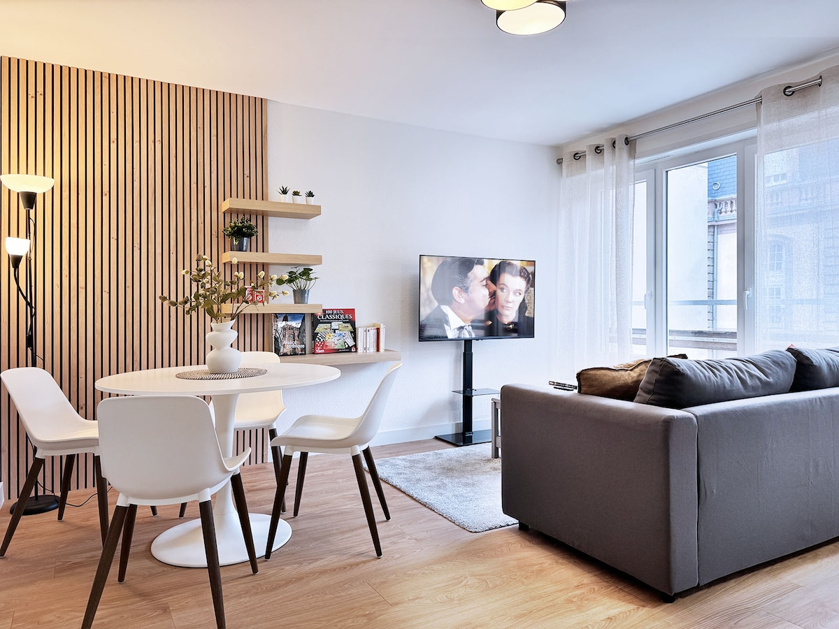 Favoritt i PLOBSHEIM!! Kom og oppdag vårt lille, totalrenoverte alsaciske hus i Plobsheim, 20 minutter fra Strasbourg, 35 minutter fra Europa-Park og Obernai. "Chez Marie-France" - Leilighet 2 er en duplex på 60m² helt til din disposisjon med en uteterrasse, en privat parkeringsplass, alt i en fullt utstyrt og luftkondisjonert bolig! Denne boligen er designet for å passe både en familie og en gruppe på 4 venner.