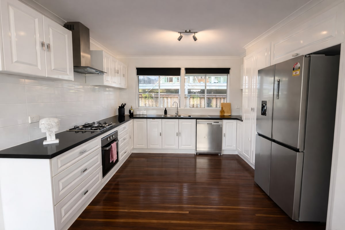 En selvstendig leilighet i første etasje i et nyrenovert toetasjes hjem – kvalitetsapparater og nye «åh så komfortable» senger! Kjøkkenet/stuen åpner seg til en stor, privat, overbygd terrasse med utendørs spisestue og fører til bassenget. Inngang i første etasje, ren, romslig, FANTASTISK beliggenhet! Mindre enn fem minutters gange til CityCat-fergen eller bussene, og i nærheten av Bulimbas Oxford Street-restauranter, kaféer og butikker. Ett fergehopp til Bluey's World. (Plass til familie på opptil fire personer + barneseng.) Gratis trådløst nettverk – Netflix – Stan.