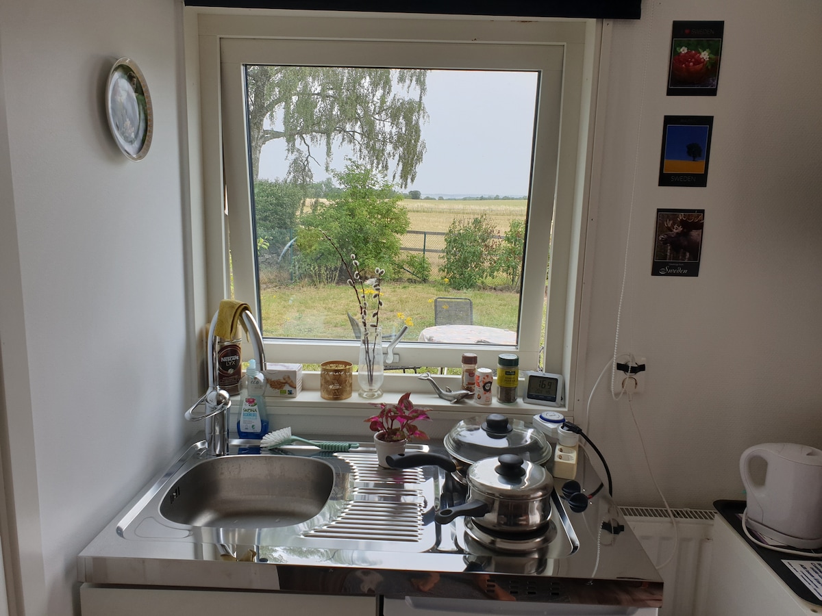 Panoramautsikt over Østersjøen, 15 meter til strand med brygge og strandkafé. Sov og våkn opp til støy fra bølger. To senger hvor du befinner deg på første rad og ser ut over havet. Kjøkkenkrok med to kokeplater, mikrobølgeovn, kaffetrakter, kjøleskap og fryser. Liten spiseplass, to lenestoler, TV og trådløst nettverk. Bad med dusj og toalett. Stor terrasse, gassgrill. Huset ligger midt i kystlandsbyen Svarte, ca. 6 km til Ystad hvor du enkelt kan kjøre med bil eller sykle langs sjøen. Bussholdeplass og togstasjon med god kollektivtransport.