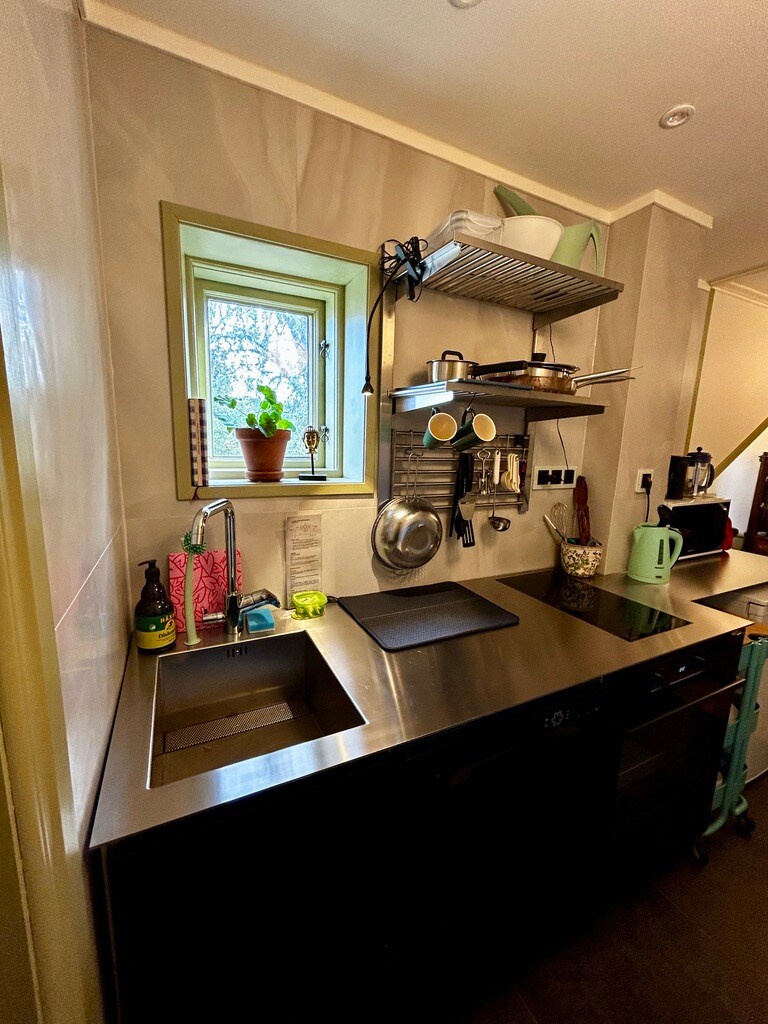 Svensk tømmerhytte, med en rollemodell fra USA. Sitt på verandaen og betrakt Japandi-hagen og Koi-fiskene våre i dammen. Lag mat, sitt og nyt, eller sov godt i et fint og fredelig miljø. Du må gjerne bruke hele hagen. Det er en veldig god italiensk restaurant i landsbyen. Gode transportforbindelser. Merk: Jernbanen ligger i nærheten, noe som kan være forstyrrende for de som sover lett. Ved behov for flere senger er det en leilighet til leie i tilstøtende bygning. Røyking i hytta og på eiendommen er forbudt på grunn av brannfare!