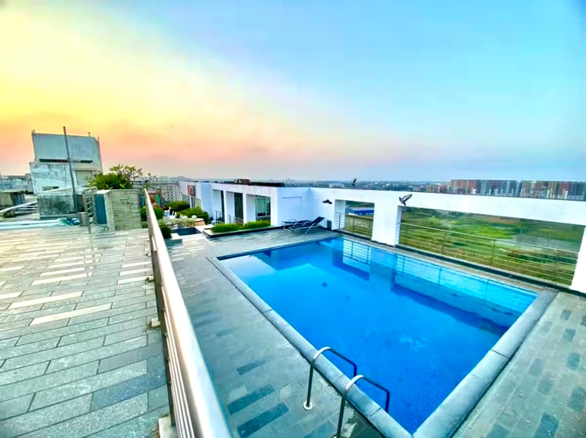 Fully furnished luxarious smart studio apartment with south facing balcony,pool,gym and garden (couple friendly).Near Airport,CC2.Guests have fun with the whole family and friends. The south facing balcony is amazing. Fully equipped kitchen with induction utensils, refrigerator ,microwave and daily needs.High speed wifi over 150 mbps.We provide tea and coffee n spices also there.A peaceful studio apartment with self check in.24×7 security...Please visit n enjoy ❤️❤️
