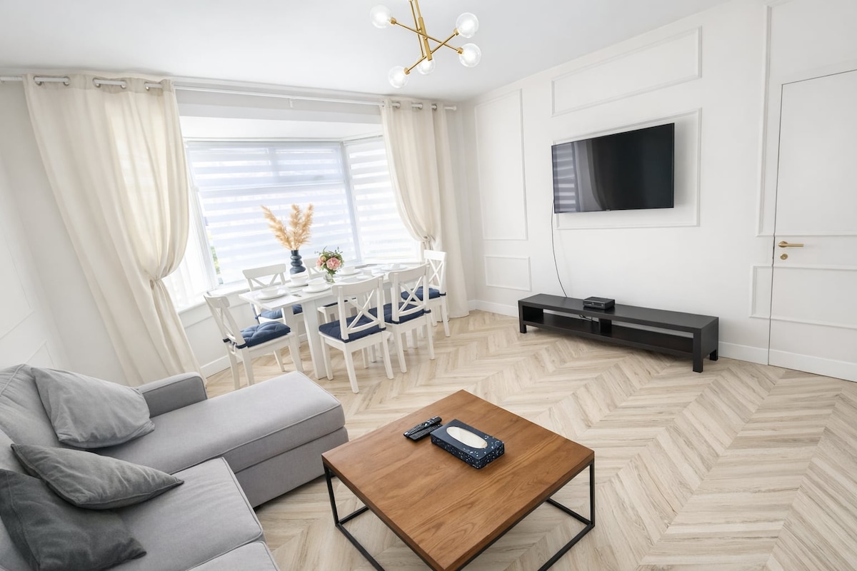 Denne stilige leiligheten med fire soverom har nettopp blitt fullstendig renovert og er fullt møblert og utstyrt med alt som er helt nytt. Vi har også en leilighet med to soverom ved siden av, med samme standard, som kan bestilles sammen med denne, noe som gir imponerende seks soverom med plass til opptil 12 gjester når de bestilles sammen. Kontakt oss for å få den beste prisen på bestilling av begge. Vi har vår egen private parkeringsplass, TV-er på alle rom, superraskt trådløst nettverk, Virgin TV, skrivebord, spisebord og senger og sengetøy av hotellkvalitet.