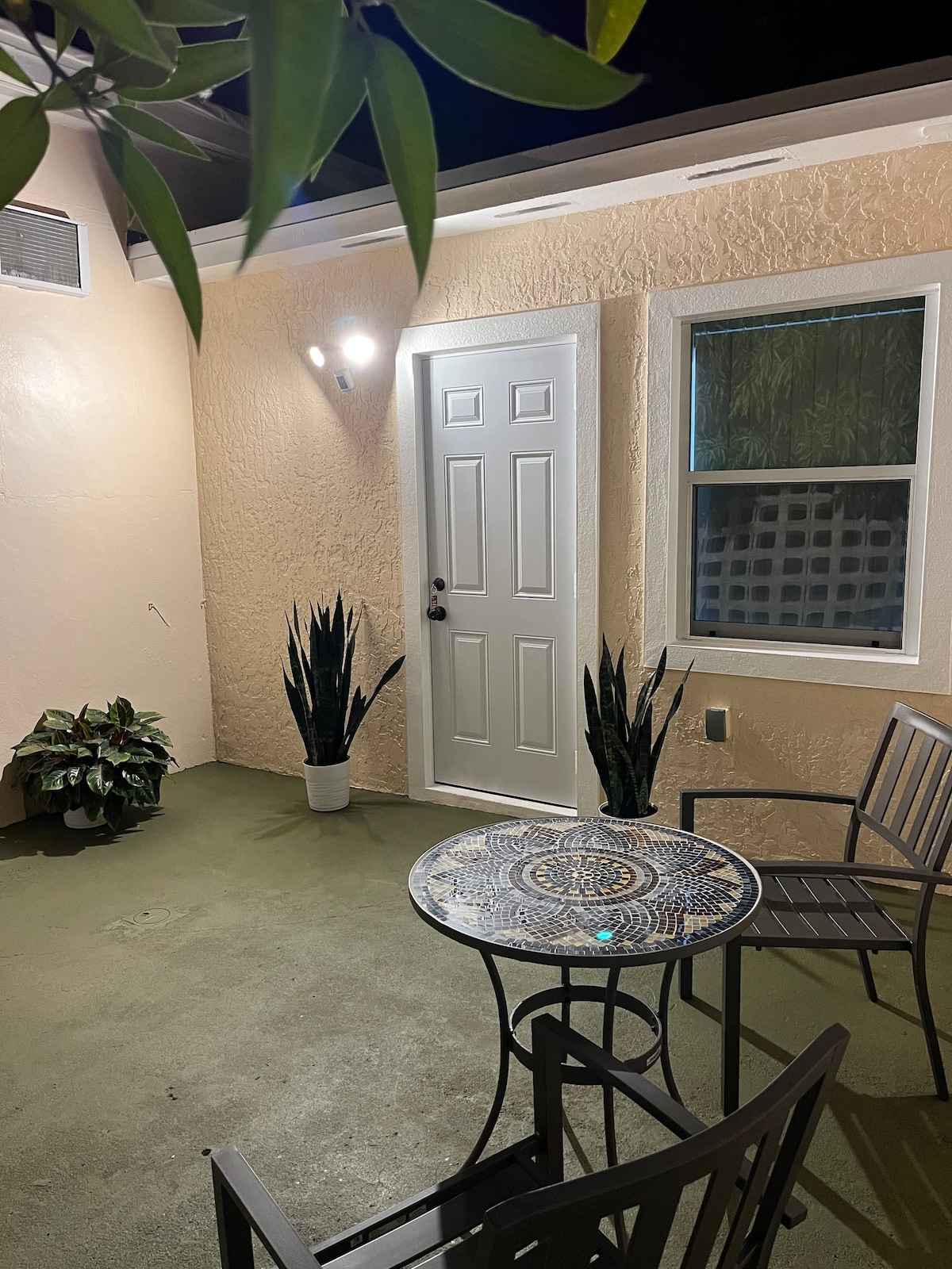 Gjestehuset ligger under eiketrær og palmer på en eiendom på 1/3 av en hektar i et rolig forstadsnabolag. Hovedhuset ligger i lokalene i den andre enden av tomten. Du kan nyte en uteplass med frokost-/middagsbord. Du går inn gjennom hagen og går ca. 100 trinn til gjestehuset. 5/10 minutters gange til Publix, CVS, Dollar Tree, Pizza Hut, Taco Bell, McDonald's og mer Red White and Blue Thrift store, Moca Museum, 10–20 minutter unna Miamis uteliv.