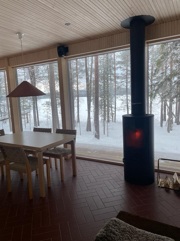 Stemningsfull og romslig tømmerhytte på et rolig sted ved bredden av en ren innsjø. Omfattende utstyr og et fullt utstyrt kjøkken, inkludert oppvaskmaskin, komfyr, mikrobølgeovn, kaffetrakter osv. Hytta har også for eksempel trådløst nettverk, TV, badstue, innendørs toalett og vaskemaskin. *EGET SENGETØY ELLER LEIE 25 EUR/PERSON*. Kjæledyr avtales separat. Et flott sted å gå turer, stå på ski, svømme, fiske, plukke bær eller dra på båttur – avhengig av årstiden. Spør leietakeren om muligheten for å leie en bil!