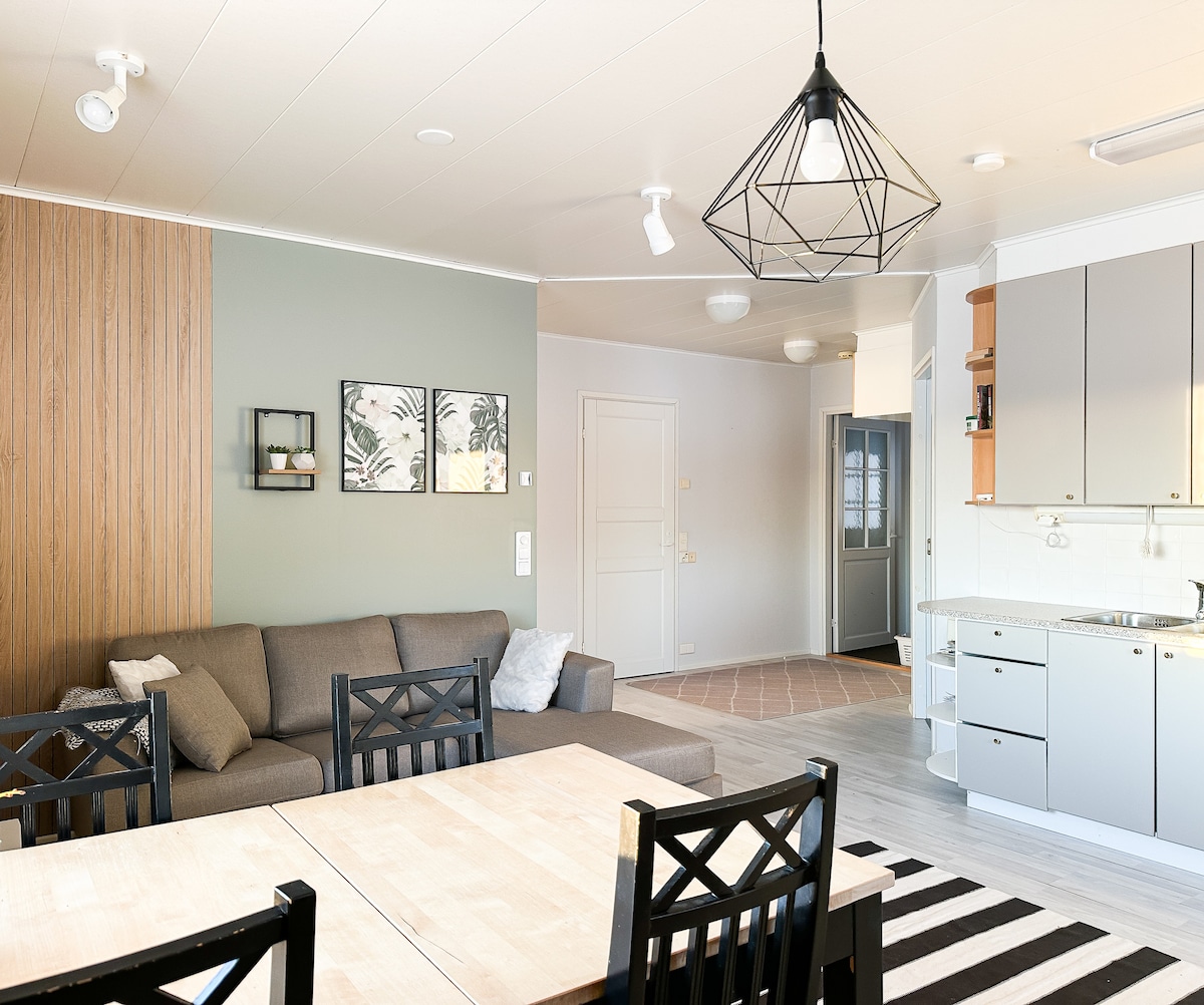 Vi ønsker at oppholdet skal være mer enn bare en seng langt hjemmefra. Vår idé er å tilby et høyt nivå og komfortabel hjemlig innkvartering, slik vi selv ønsker å bo. I den hjemmekoselig innredede leiligheten finner du fire komfortable senger som er ferdig oppredet, samt en badstue. Hjertelig velkommen!