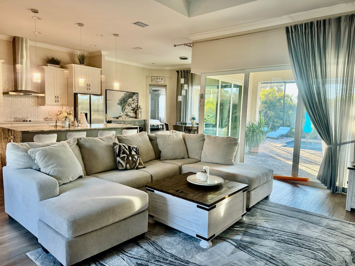 Stuen har en 65" smart-TV, veggmontert med en LCD-peis under med surroundlyd. Alle TV-er har Netflix. Barrommet har et lite kjøleskap, biljardbord og dartbrett. Ute har en privat lanai med oppvarmet basseng og en propanbålpanne. Nyt sonos-lyden med 55" smart-TV i hovedsoverommet. Det andre soverommet har også en TV. Barrommet har også Sonos, i likhet med verandaen. 30 minutter fra flere strender. Garasjen er ikke tilgjengelig. Hjemmet ligger i en rolig blindvei.