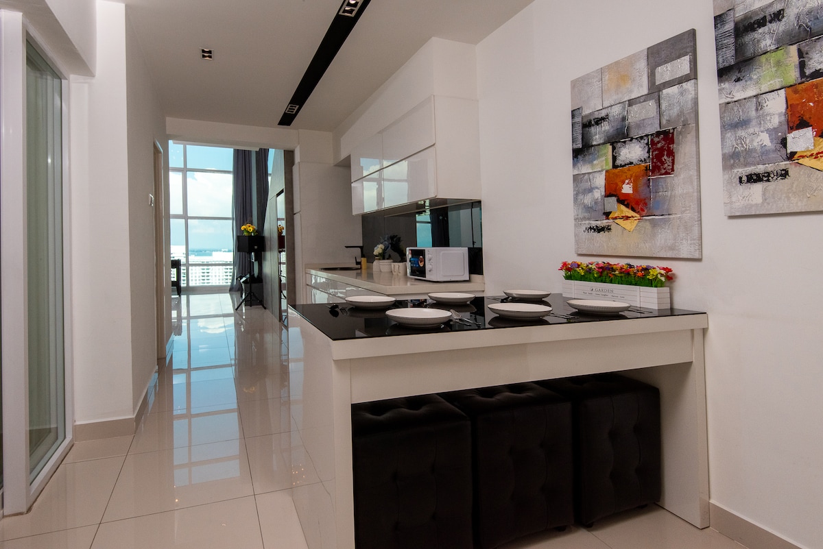 *Den beste BELIGGENHET i Penang, GURNEY DRIVE, turistdestinasjonen nr. 1. *EN DUPLEX CORNER-enhet *Fantastisk høy etasje, SOLOPPGANG MED HAVUTSIKT. *JAPANSK design med alle fasiliteter * SMART-TV *100 Mbps TRÅDLØST NETTVERK. *Nyt en fantastisk soloppgang fra SOVEROM, sitte- og spisesal. * Omgitt av HOTELLER, KJØPESENTRE og en rekke LOKALE restauranter. *Gratis én INNENDØRS parkeringsplass *Fasiliteter inkludert INNENDØRS svømmebasseng, treningsstudio og Sky Lounge *Avslappende fotturer VED VANNET.