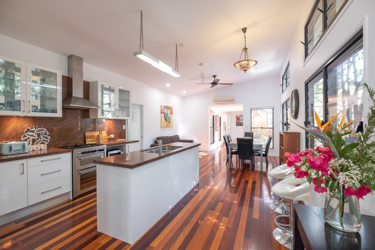 Professionally cleaned between guests. Walking distances to Howard Smith Wharves, James St, CBD & The Valley. 20min drive from the airport. 5 double bedrooms all air-conditioned, 3 living areas, separate dining room, modern kitchen, 2.5 baths and fully fenced section. Ornate ceilings and period features and beautifully furnished with quality linen. Ideal for couples, small groups, families, and pet friendly. Set up for holiday rentals, so no personal possessions around. Your home away from home.