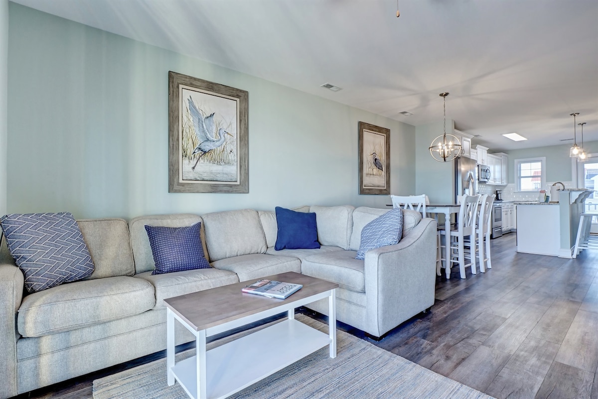 Pust inn den friske sjøluften og nyt den vakre havutsikten fra ditt eget hjem ved stranden. Dette treetasjes rekkehuset tilbyr tre luksuriøse soverom, 2,5 bad, et komplett kjøkken og elegant oppholdsrom. Plask rundt i det felles bassenget og boblebadene, eller ta en kort spasertur over sanddynene for å kjenne sanden mellom tærne. Ett minutts spasertur til stranden. To minutter med bil til Sea View Pier. 18 minutter med bil til Surf City Pier. Opplev North Topsail Beach med oss og finn ut mer nedenfor!